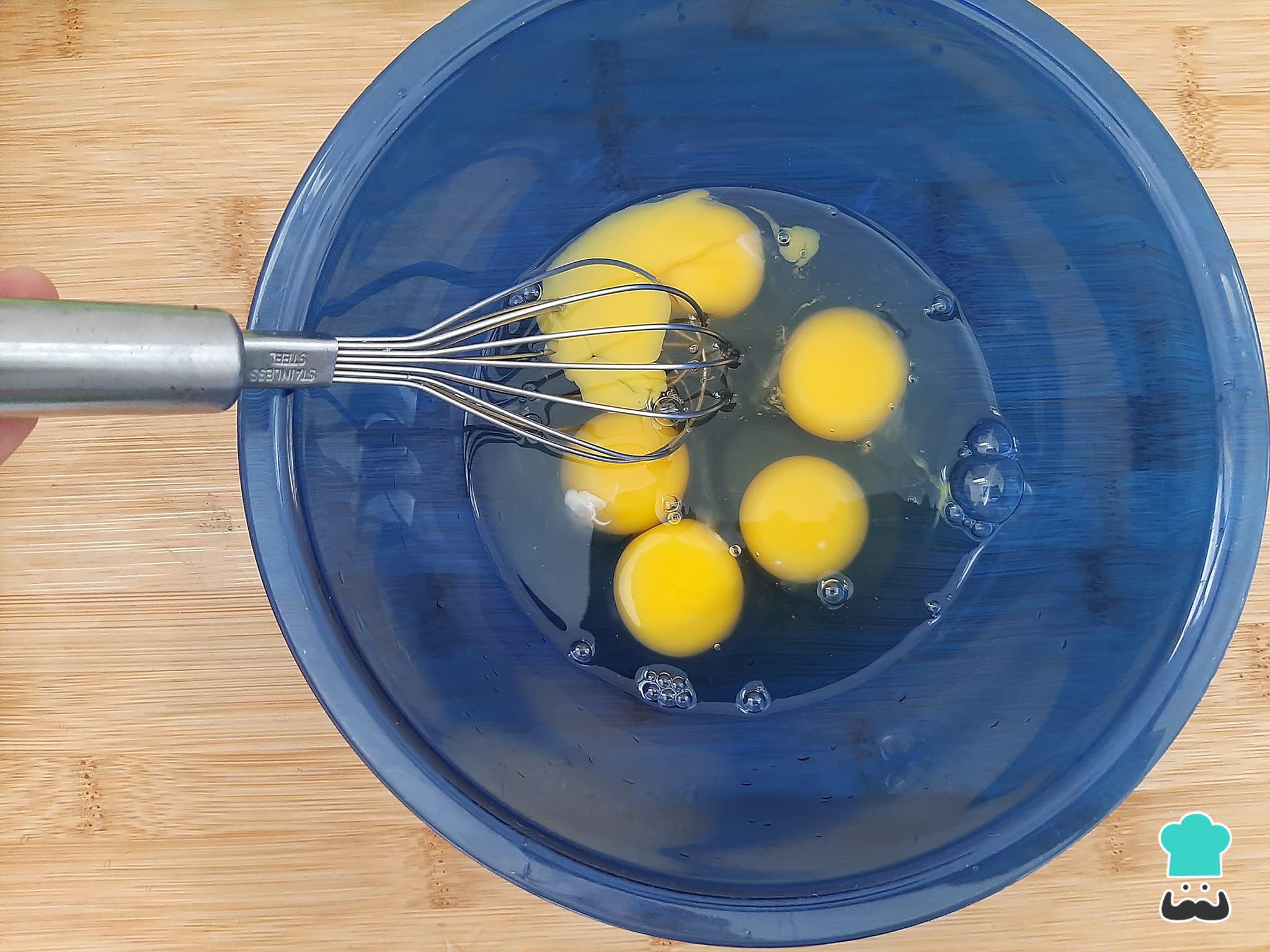 Num bowl ou tigela, coloque os ovos e bata bem com um fouet.