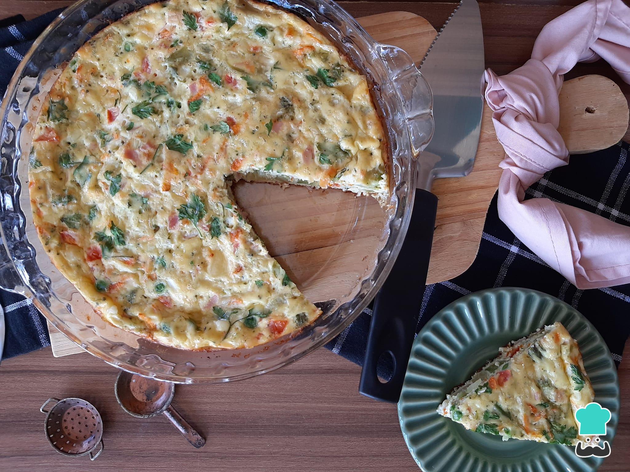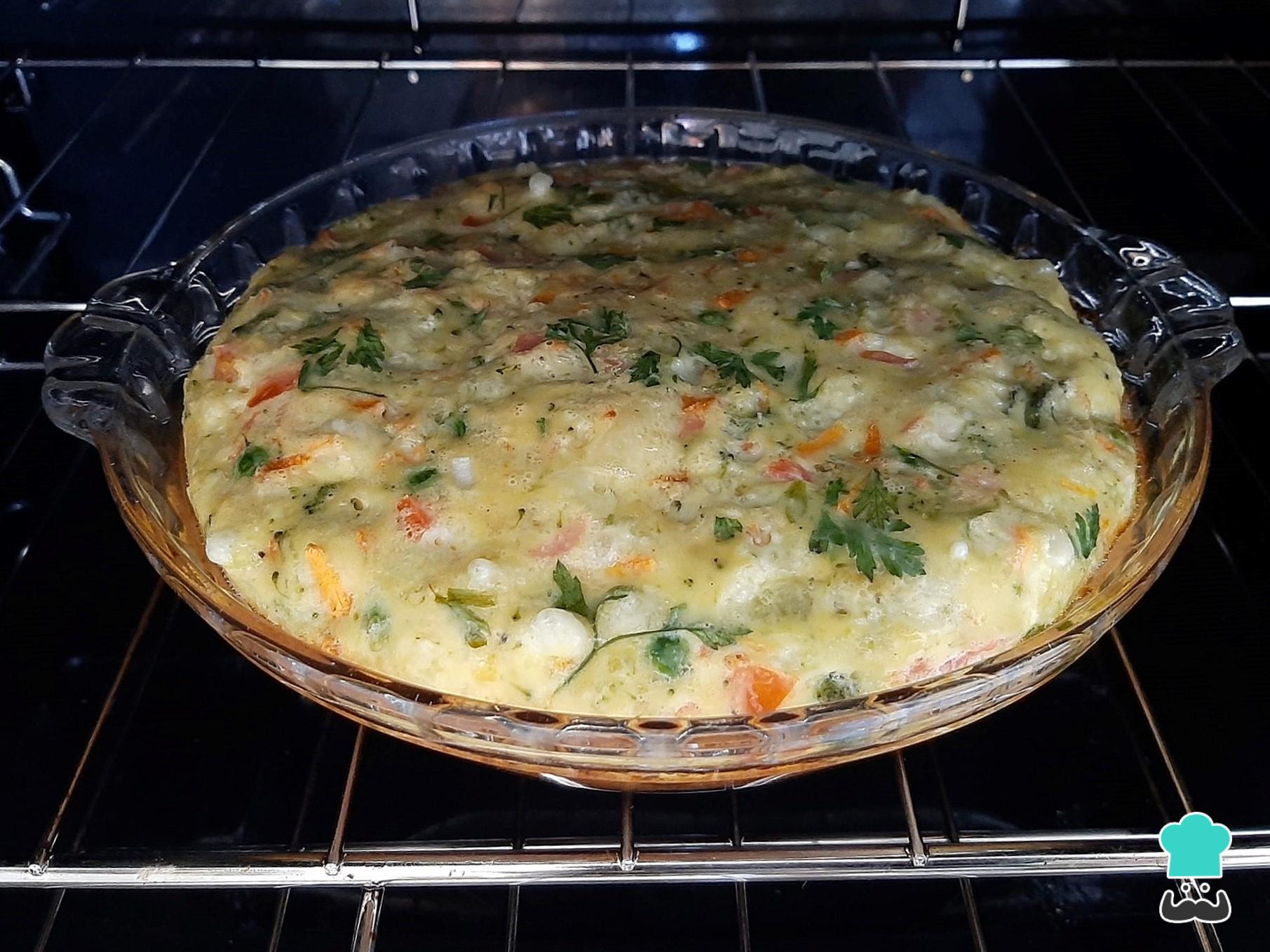 Que tal aprender a preparar um omelete de forno muito prática e até inovar acrescentando os ingredientes que você tiver disponível em casa? Na receita que fizemos aqui, incluímos brócolis cozido, cenoura, pedacinhos de queijo e de presunto, ervilhas, tomate, cebola, cheiro verde e alguns temperinhos.