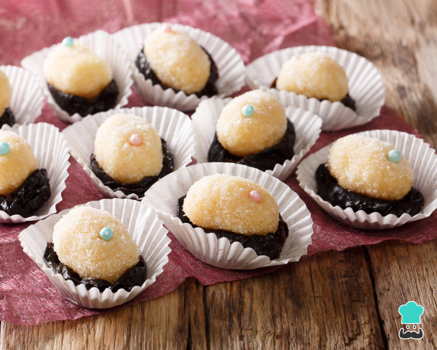 Retire porções do doce de ovos e coco preparado anteriormente e modele em forma de bolinho. Passe no açúcar ou no coco ralado e recheie as ameixas com ele.