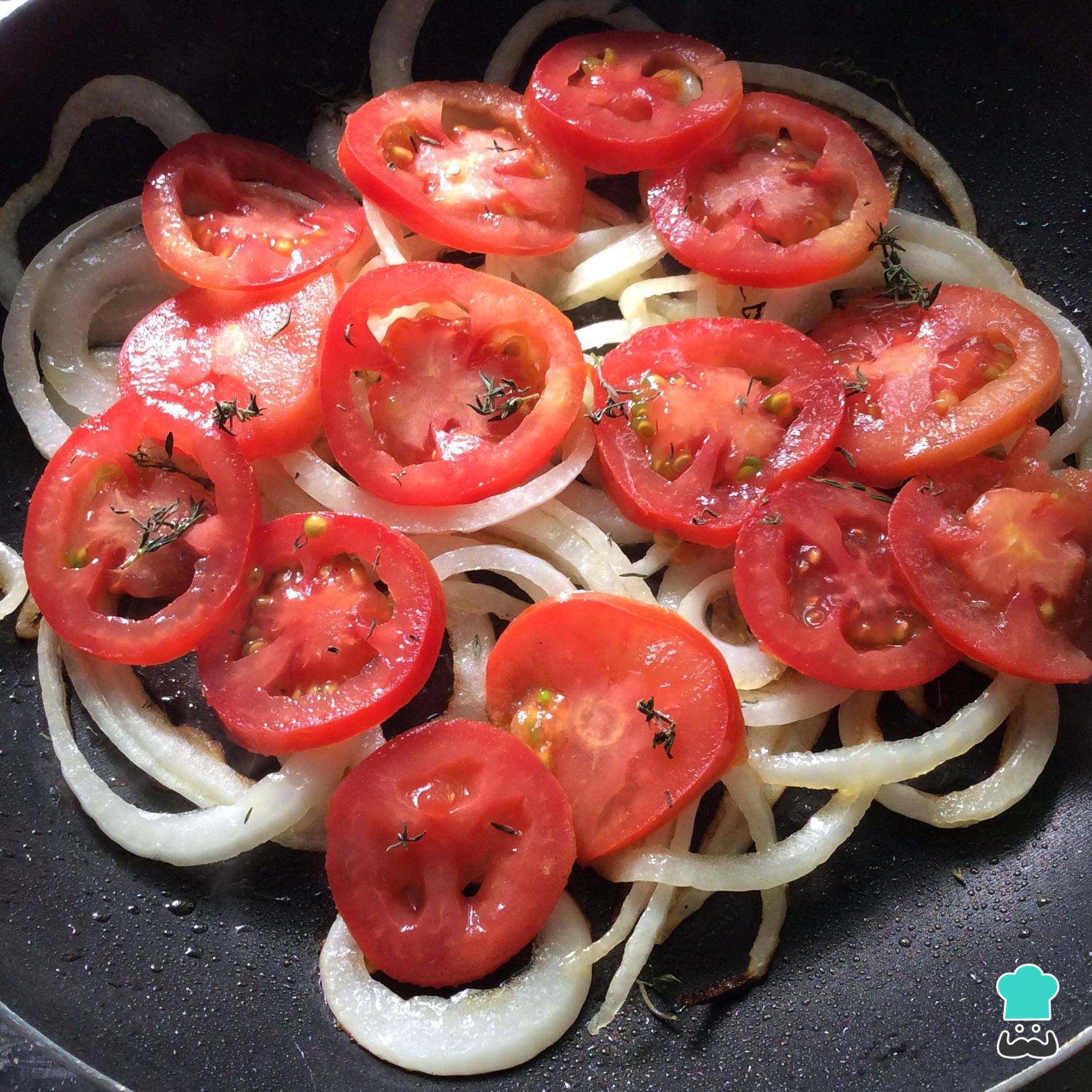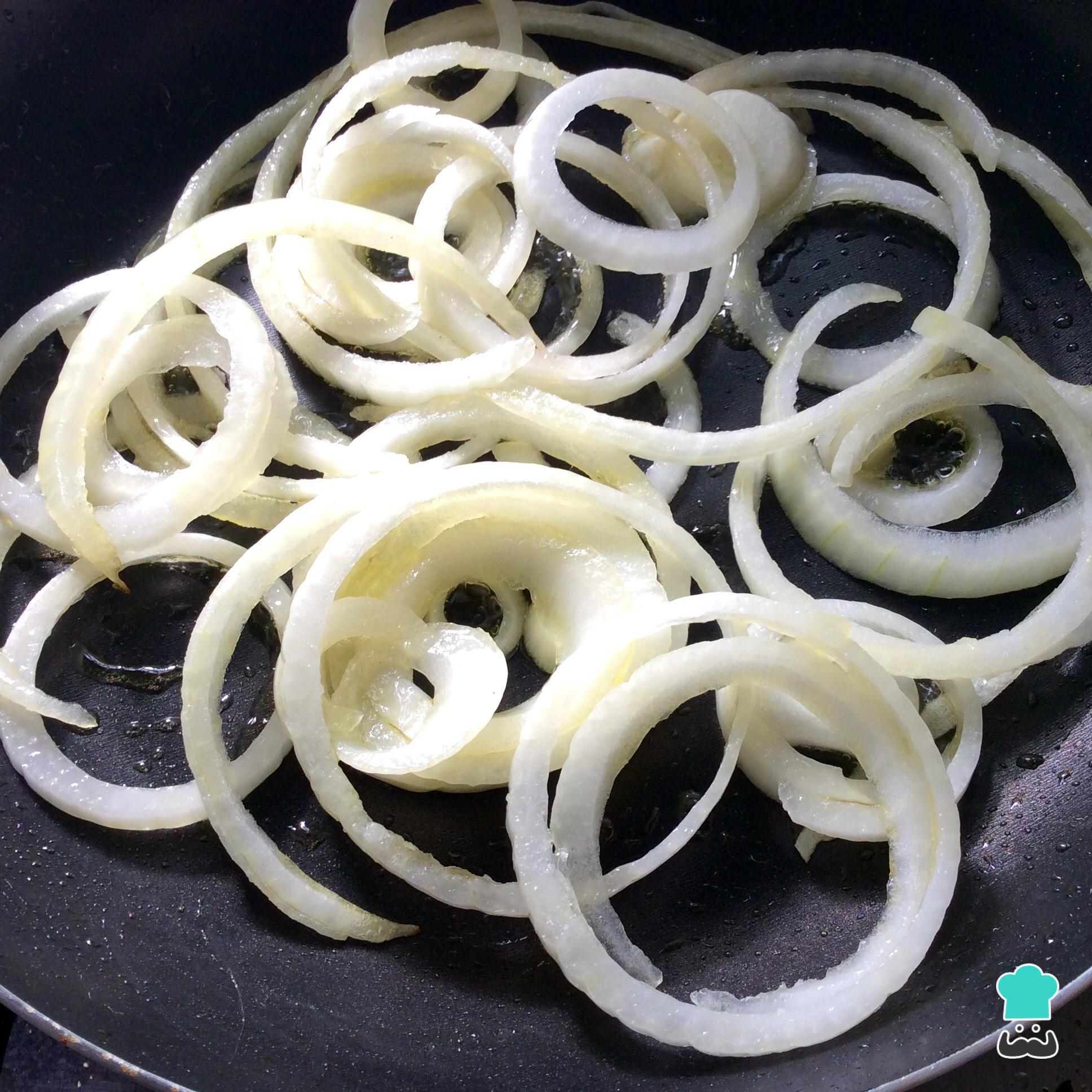 Corte a cebola em rodelas e cozinhe-a em uma frigideira anti aderente com um pouco de azeite, durante 4 minutos.