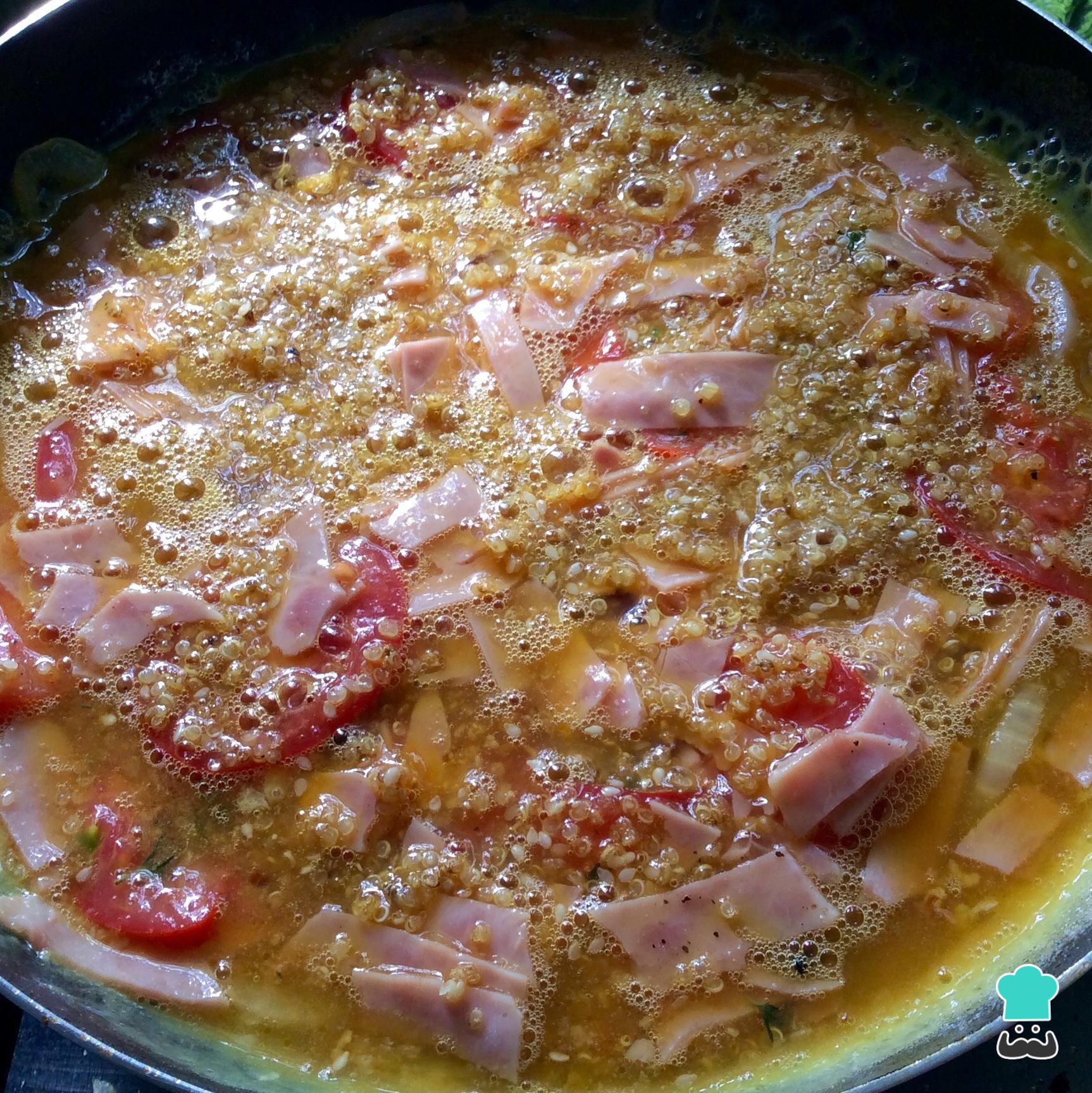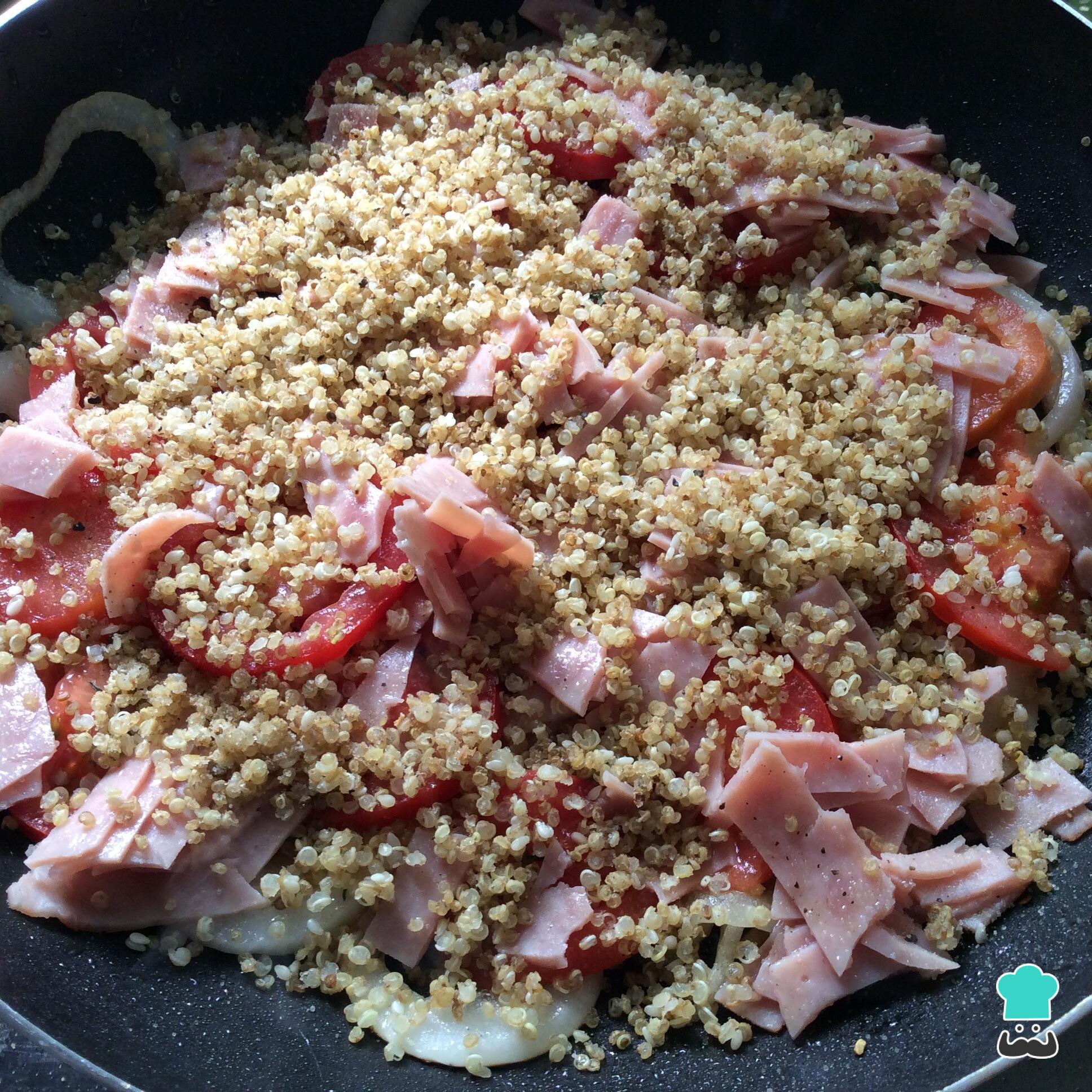 Finalmente adicione a quinoa e o presunto. Envolva bem todos os ingredientes.