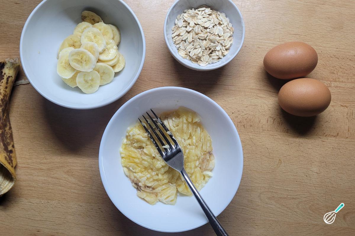 Separe os ingredientes para fazer sua omelete de banana. Para essa receita, gosto de usar bananas um pouco mais maduras que ficam mais macias e docinhas. Como gosto de doce com salgado, isso equilibra ainda mais com os ovos.