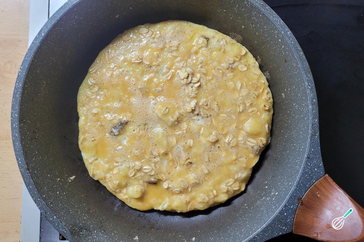 Abaixe o fogo e adicione a mistura de ovos e banana amassada. Deixe em fogo baixo por cerca de 5 minutos até ver que a mistura está bem firme e formou uma casquinha no fundo fundo antes de virar. O segredo é paciência. Se tentar virar antes de firmar, a omelete vai quebrar.