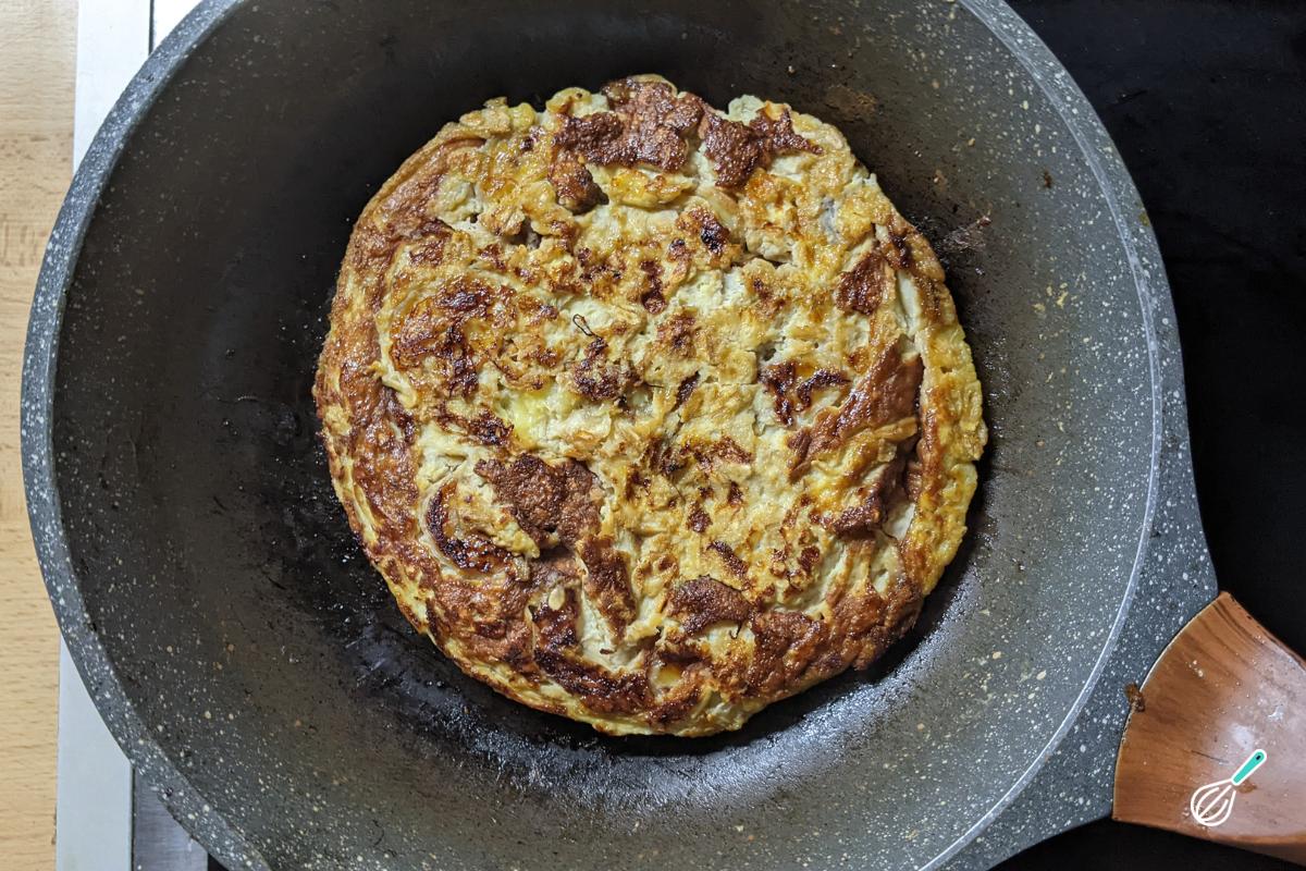 Escorregue a omelete com o lado que estava para cima para baixo para dourar do outro lado. Deixe por mais uns 5 minutos até dourar do outro lado.