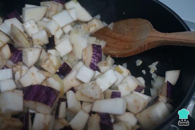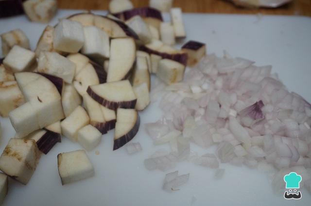 Comece por picar a berinjela e a cebola em pedaços pequenos.