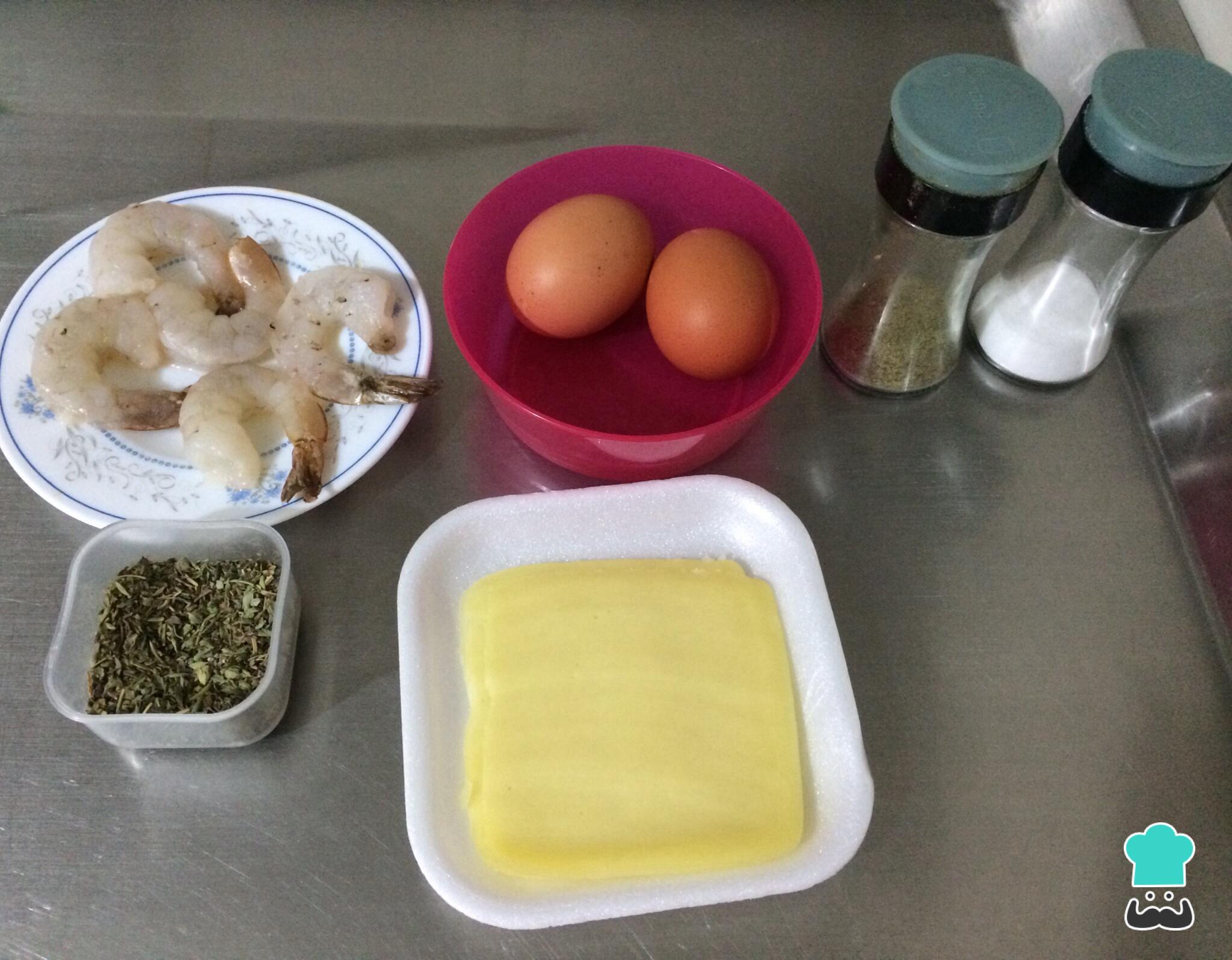 Para preparar esta receita de omelete de camarão, comece por preparar os ingredientes.