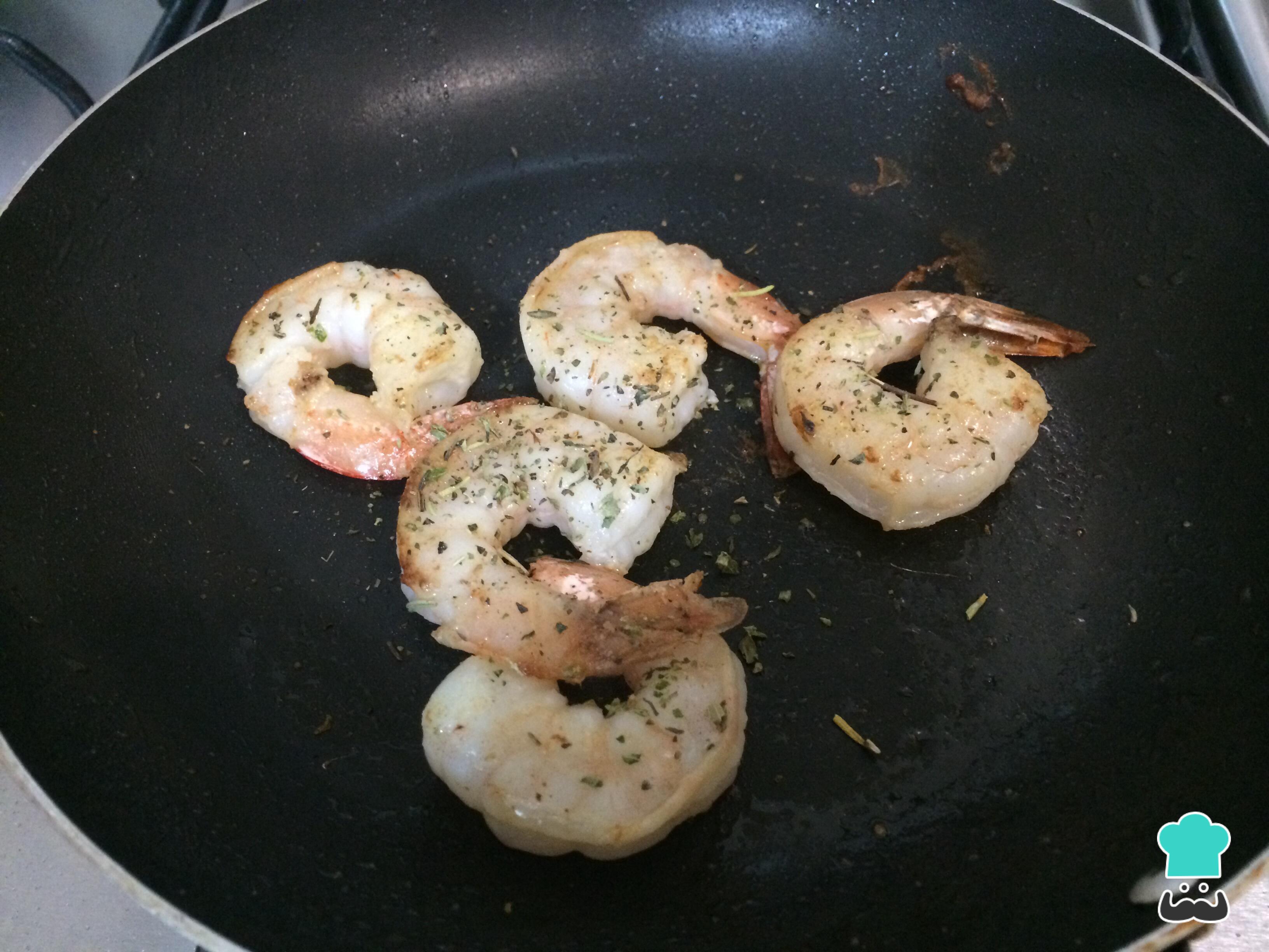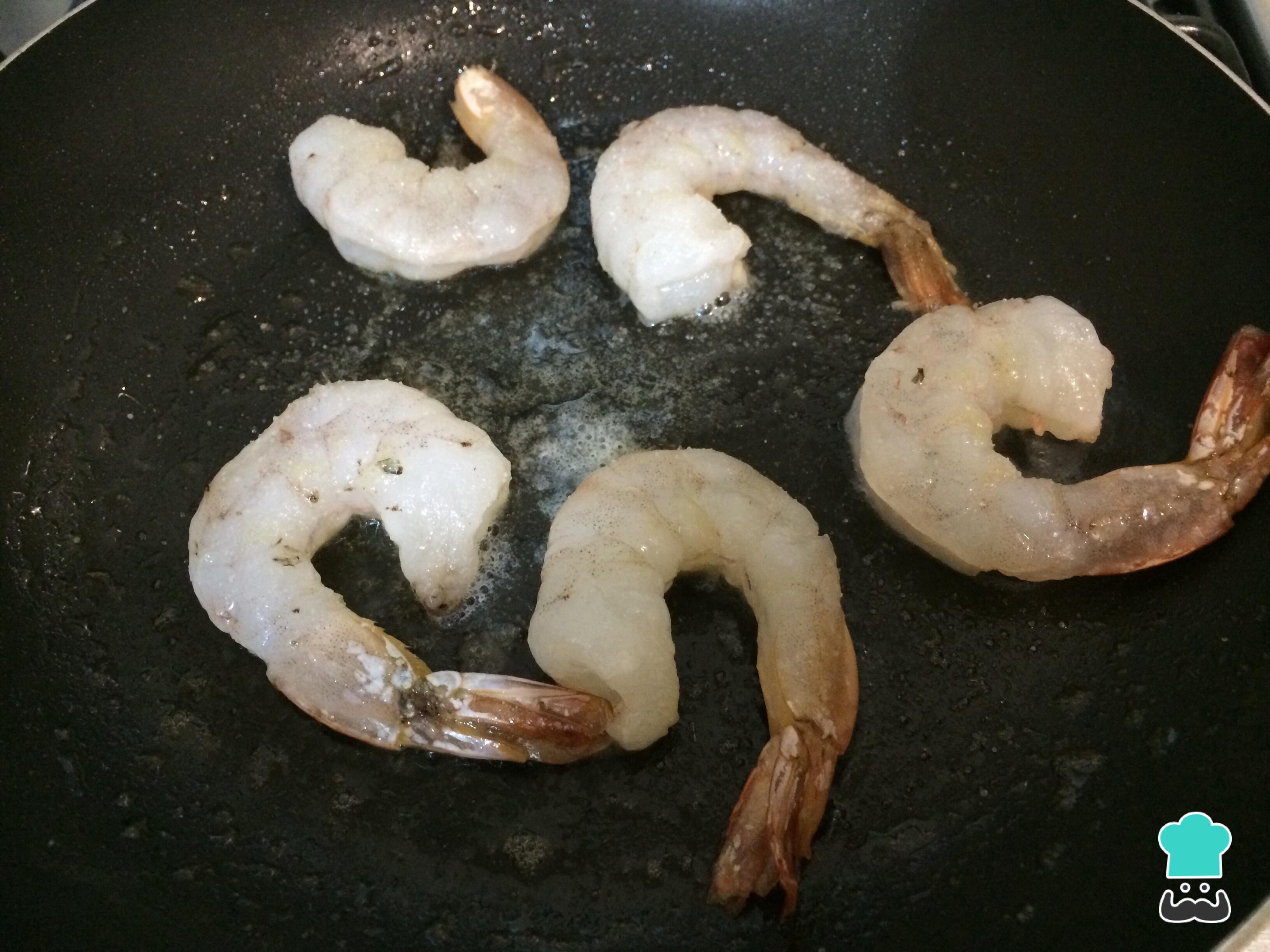 Em uma frigideira derreta um pouco de manteiga. Frite aí os camarões previamente temperados com sal e pimenta, em fogo alto por 3 minutos, ou até que estejam dourados.
