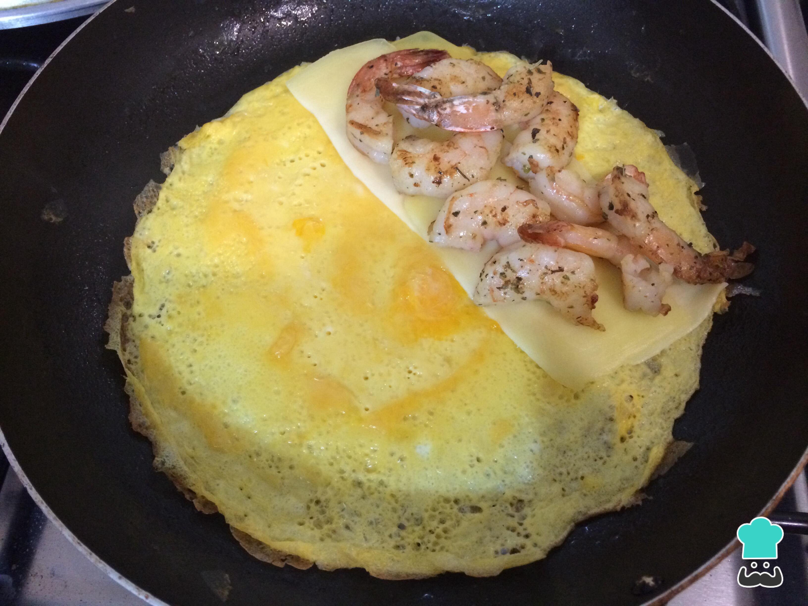 Disponha as fatias de queijo e o camarão em numa das metades da omelete. Feche com a outra metade e cozinhe até o queijo derreter.