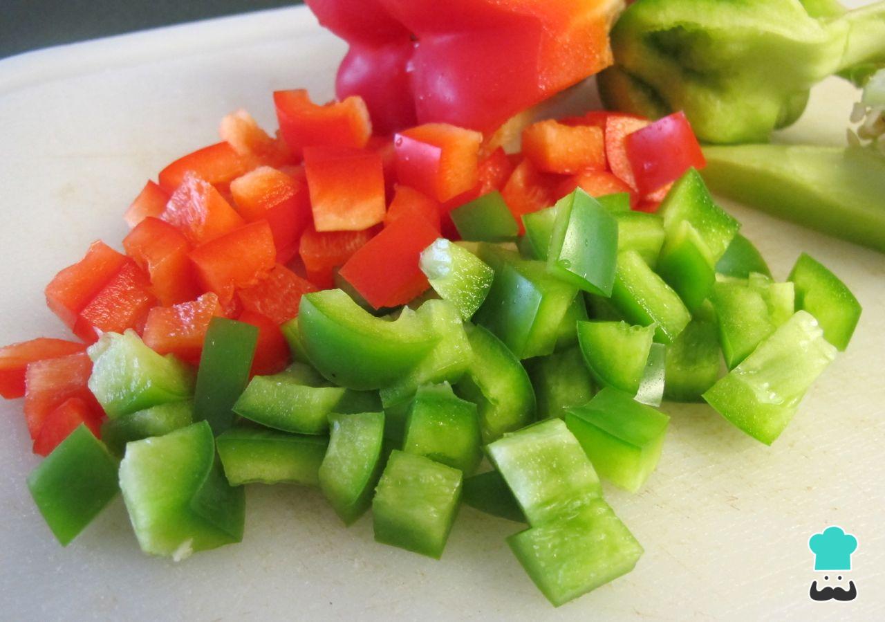 Para fazer estes burritos de omelete, comece por preparar os legumes: retire as sementes dos pimentões, e pique junto com a cebola e os dentes de alho. Leve a refogar numa panela com o óleo, em fogo médio, mexendo de vez em quando.
