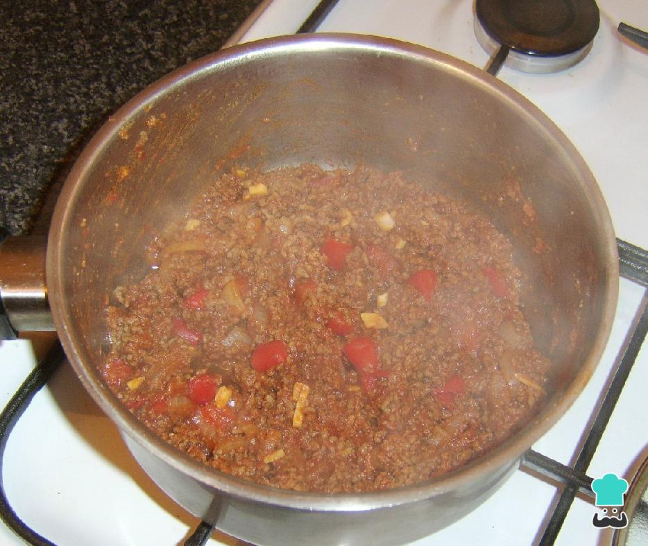 Enquanto isso, tempere a carne moída com o tempero para carne, sal e pimenta a gosto, e misture com as mãos. Adicione à panela quando os ingredientes estiverem douradinhos, e fique mexendo até a carne estar soltinha e cozinhada.