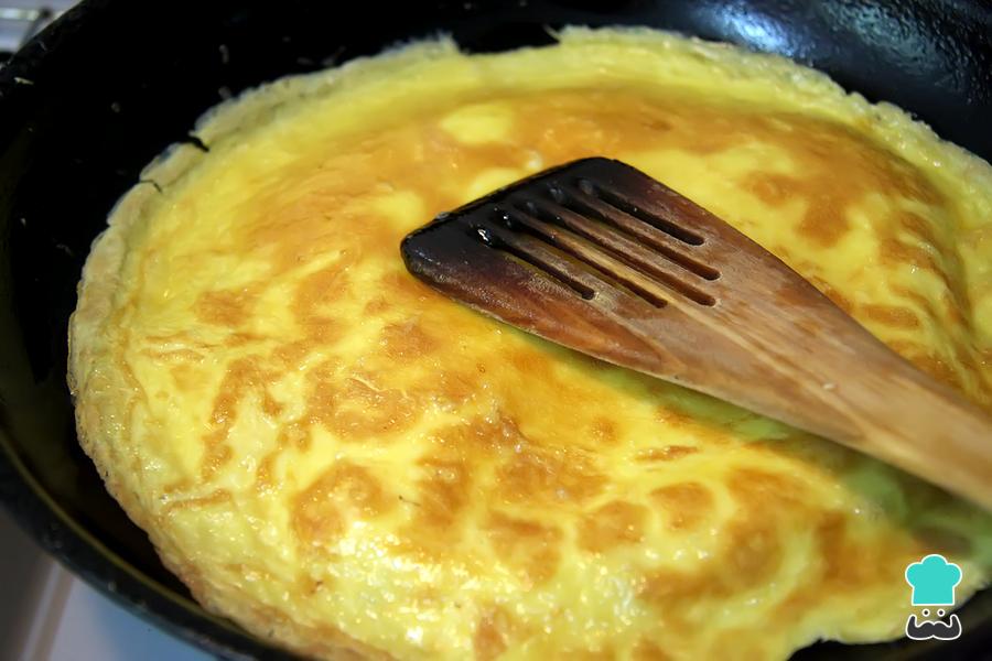 Leve ao fogo uma frigideira levemente untada, coloque um pouco da mistura, e cozinhe de um lado e do outro, até obter uma omelete firme e dourada. Retire e repita novamente, até completar 4 omeletes.
