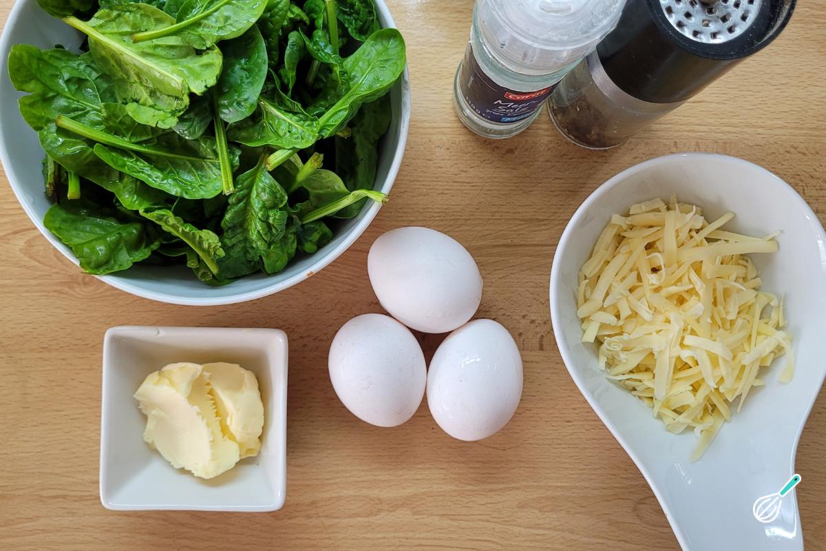 Separe os ingredientes para fazer seu omelete de espinafre e queijo.