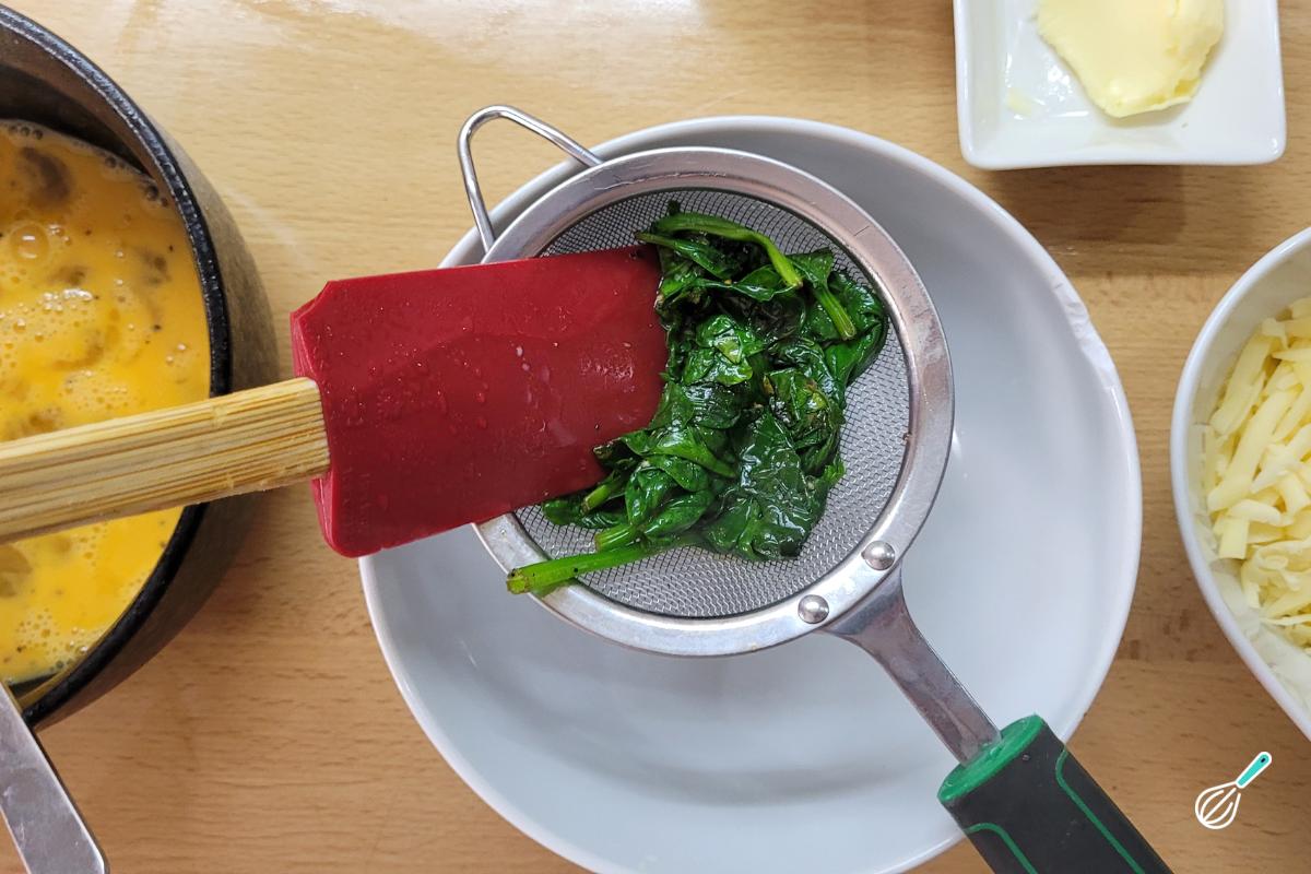 Quando o espinafre estiver murcho, retire da frigideira e transfira para uma peneira com uma tigela embaixo. Aperte para sair o excesso de líquido - isso vai deixar a omelete com uma textura melhor.
