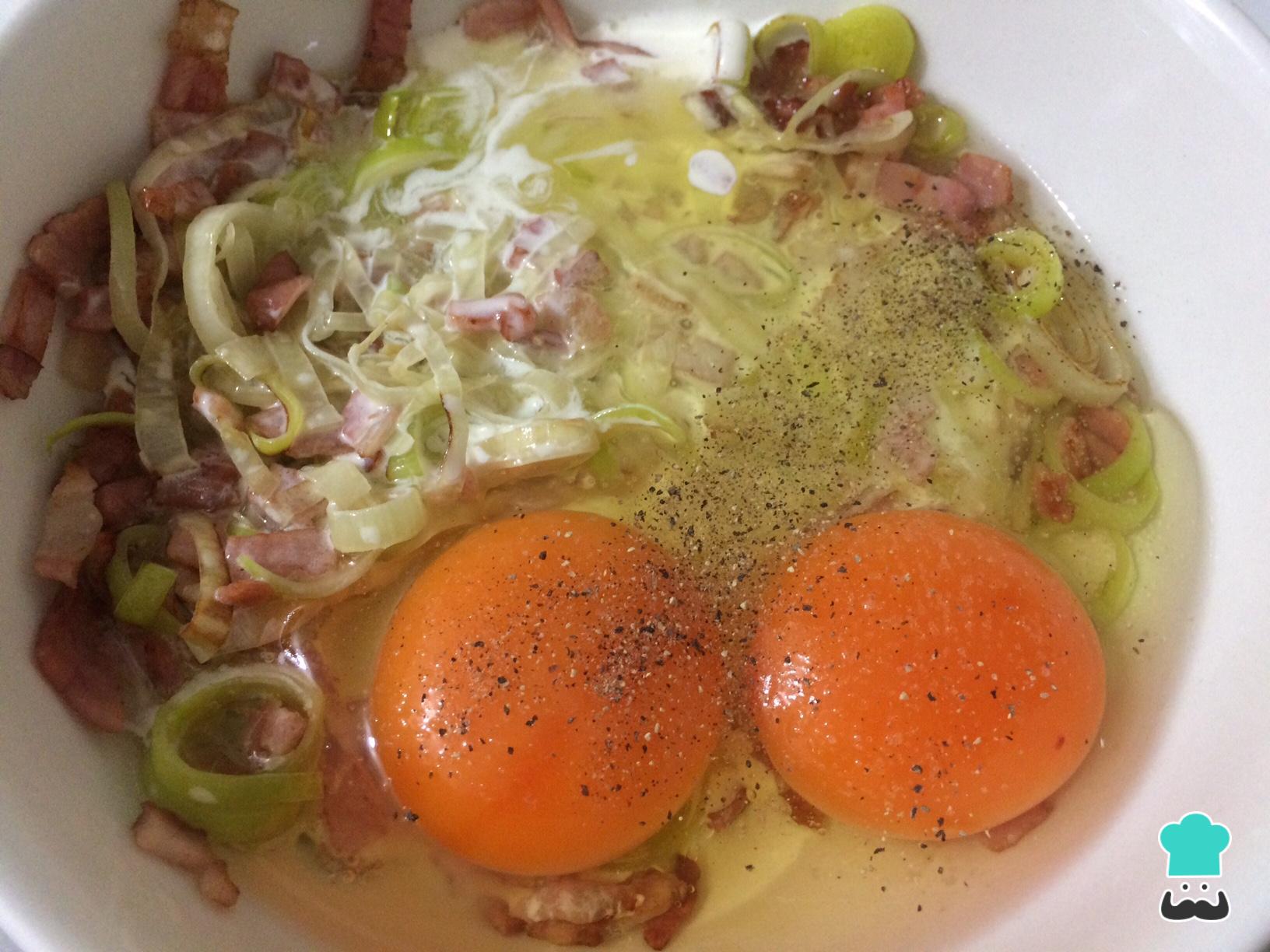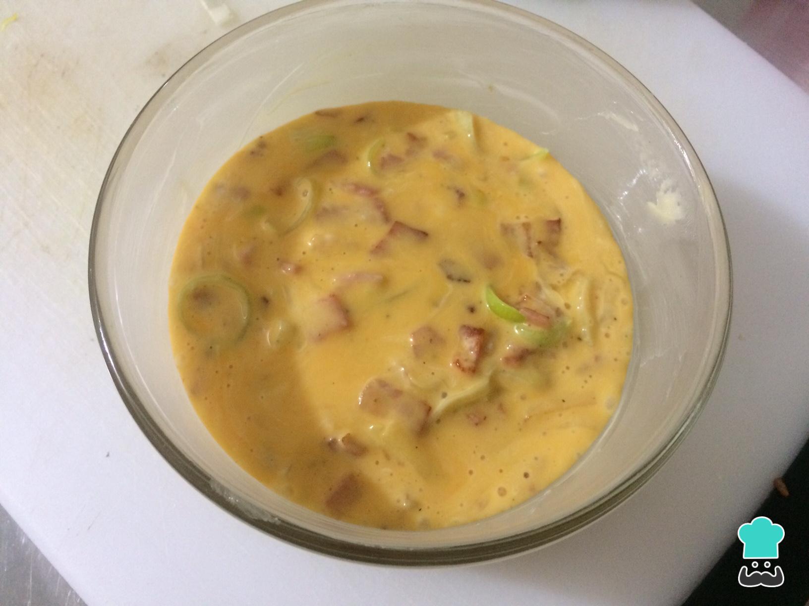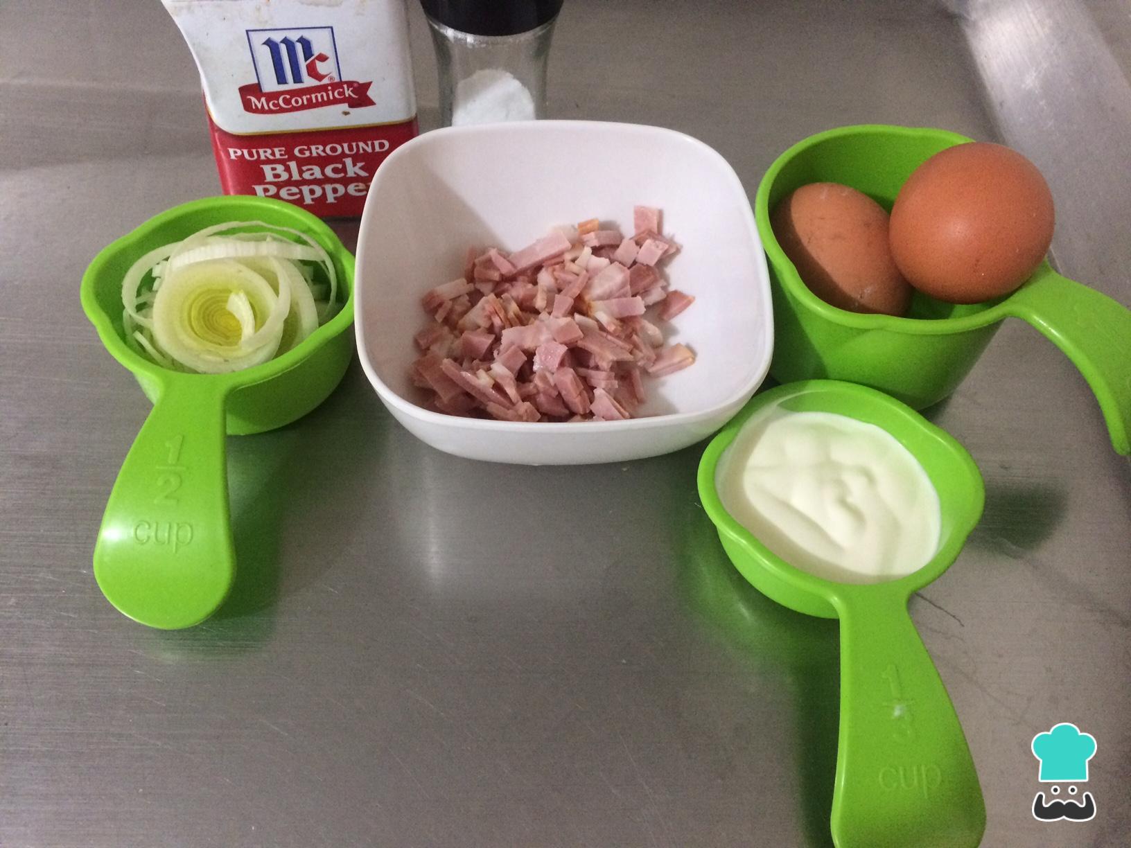 Comece por reunir os ingredientes desta receita saudável. Estaremos preparando uma omelete de forno simples com creme de leite, alho poró e bacon. No entanto, se você preferir, pode substituir o alho poró por cebola e o bacon por presunto, por exemplo.