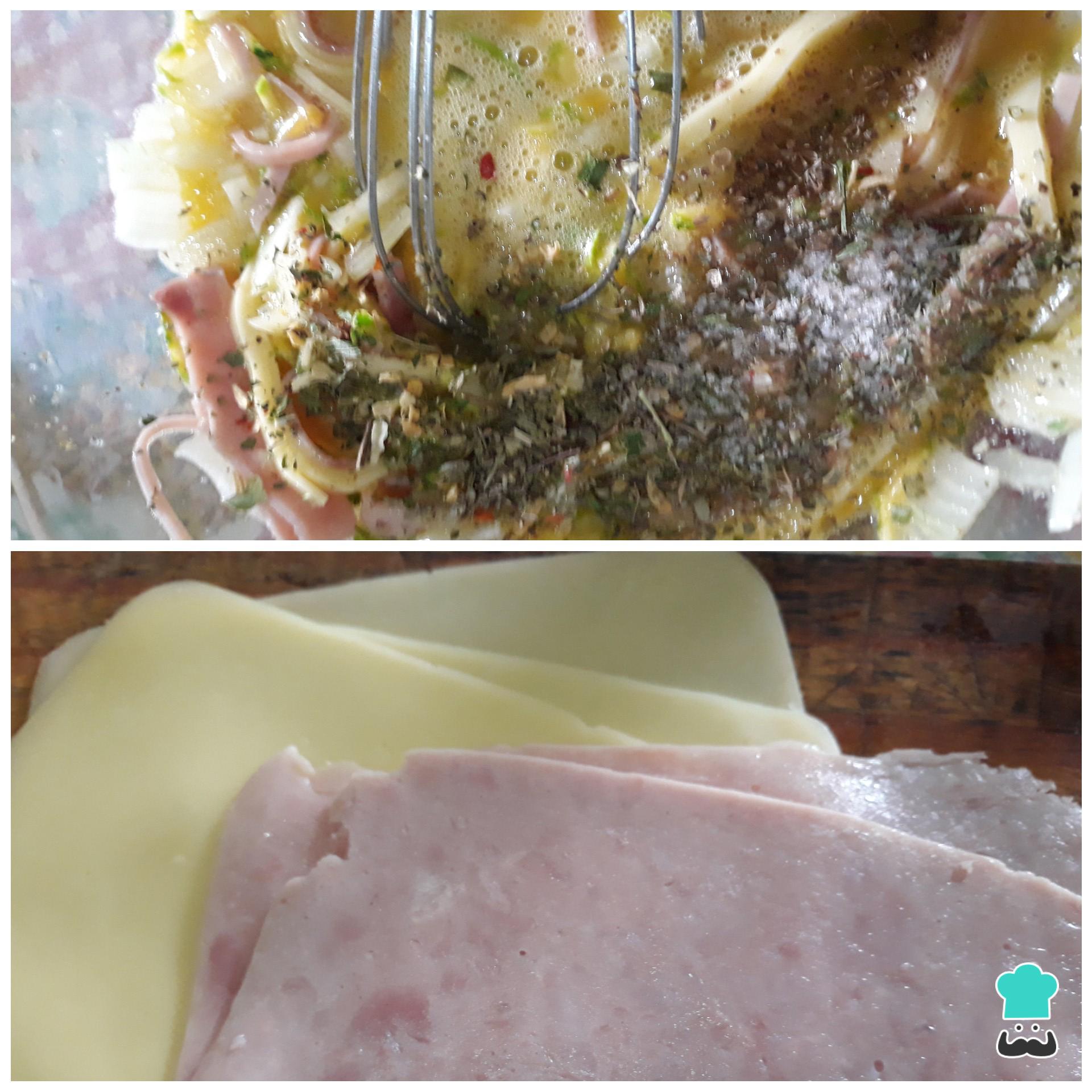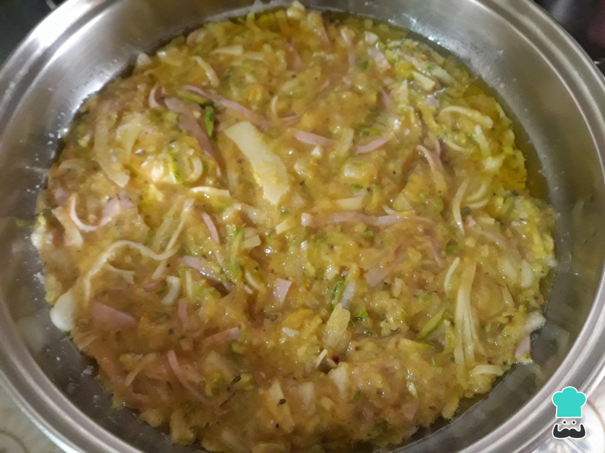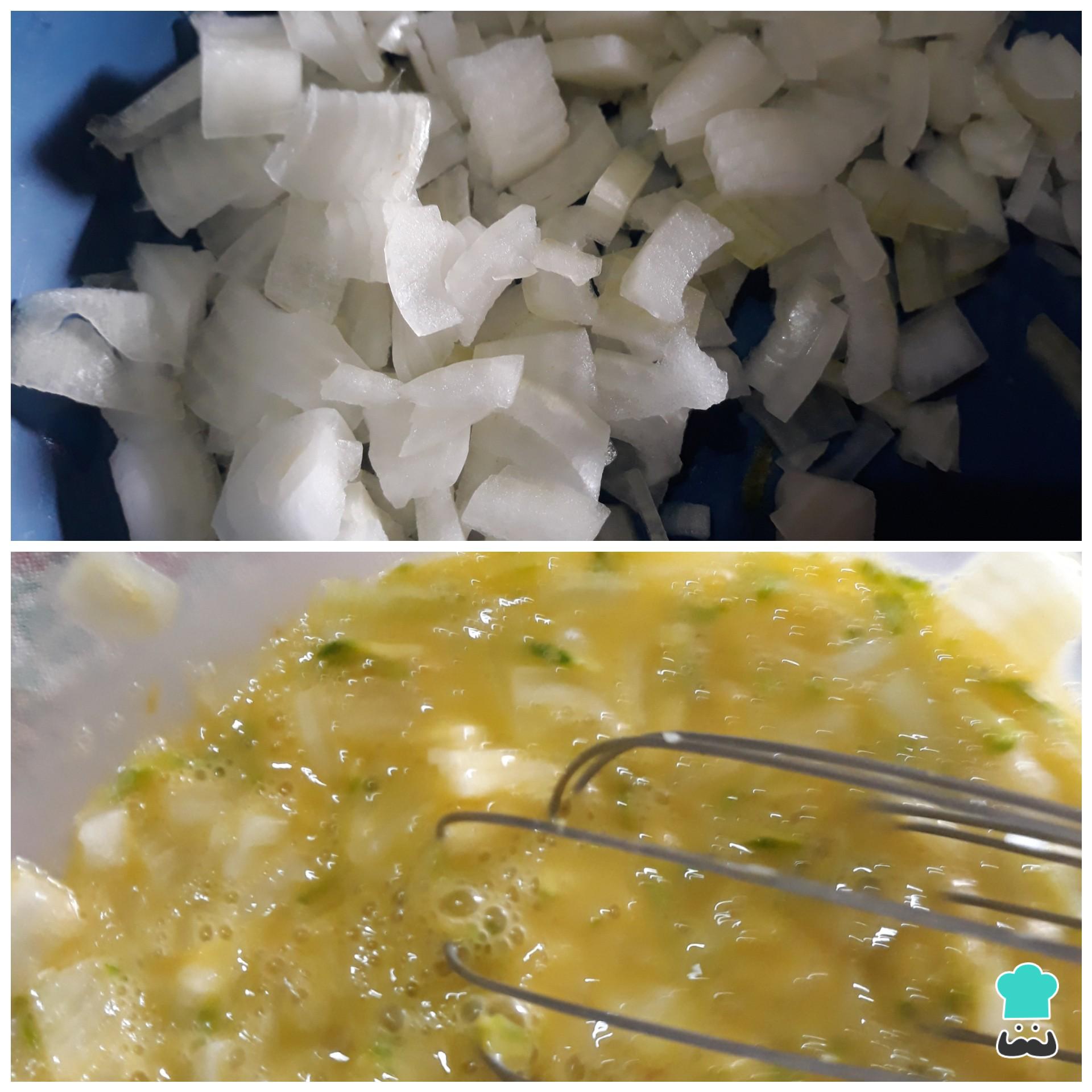 O passo seguinte desta receita de omelete é incorporar a cebola e a abobrinha refogada nos ovos batidos.