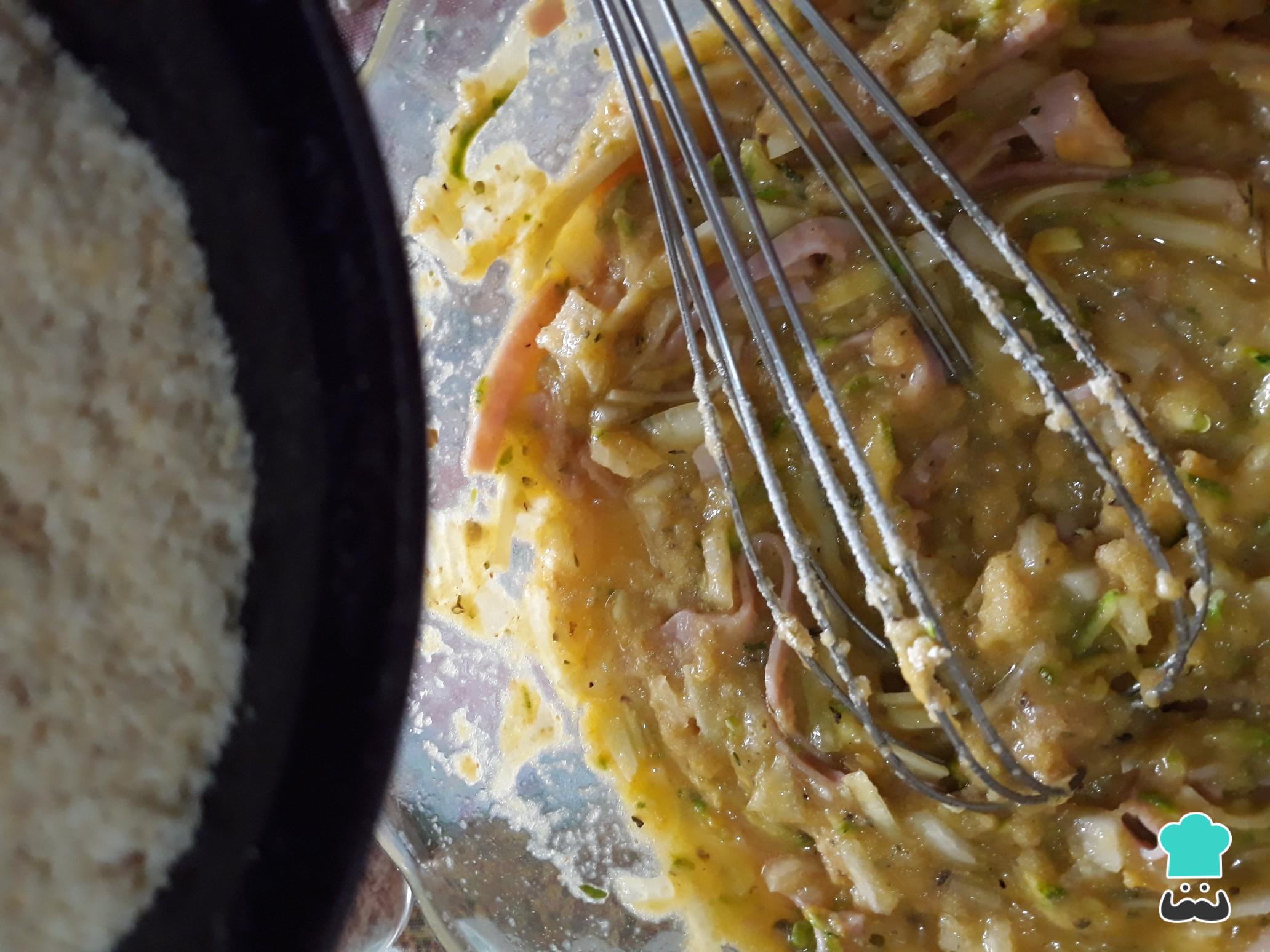 Por fim coloque a farinha de rosca, esse ingrediente ajuda a engrossar a mistura deste omelete de ovo e legumes.
