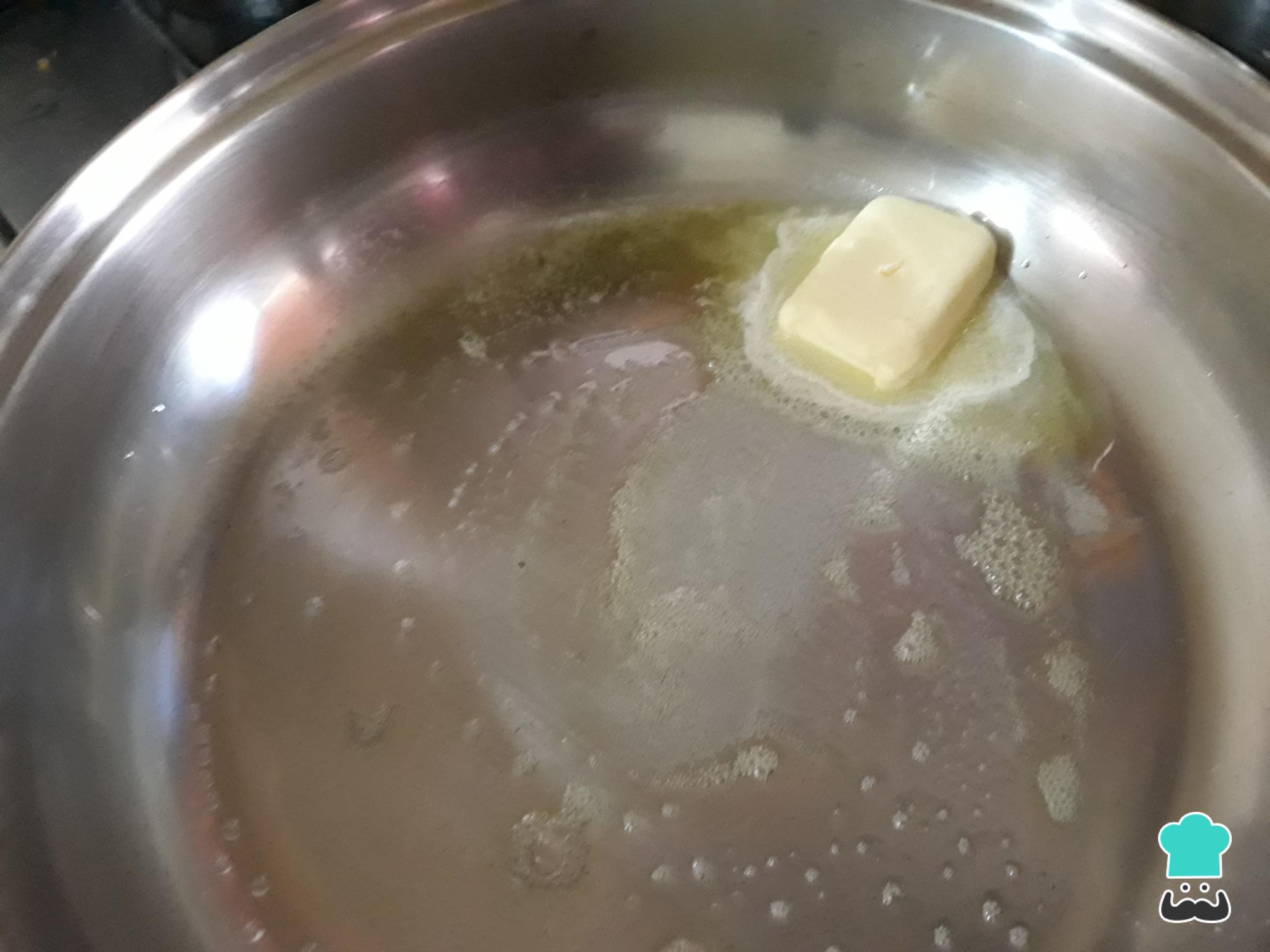 Numa frigideira em fogo baixo coloque a manteiga e um fio de azeite, um truque para evitar que a manteiga queime antes de derreter.