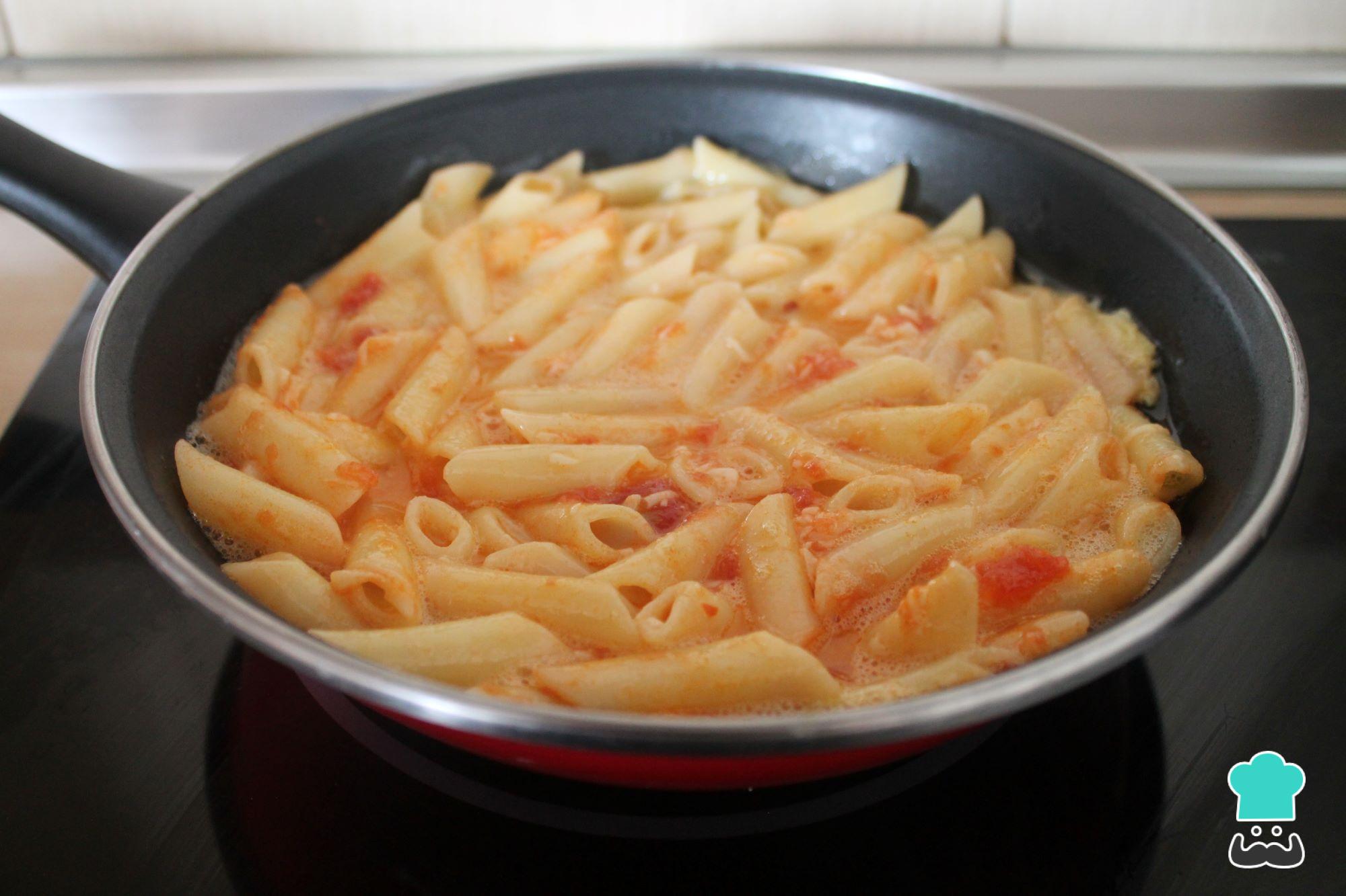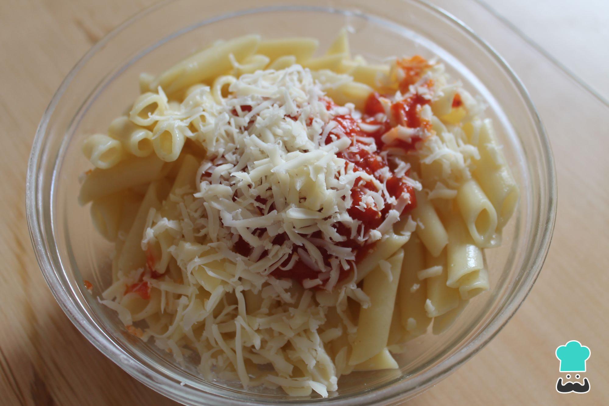 Quando o macarrão estiver al dente ou a seu gosto, escorra e transfira para uma tigela para adicionar o tomate frito e o queijo ralado. Misture bem.
