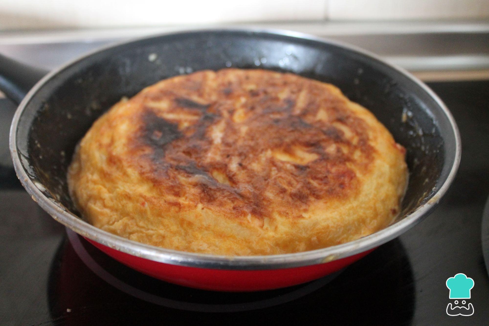 Com a ajuda de um prato, vire o omelete e coloque-o novamente na panela para cozinhar do outro lado.