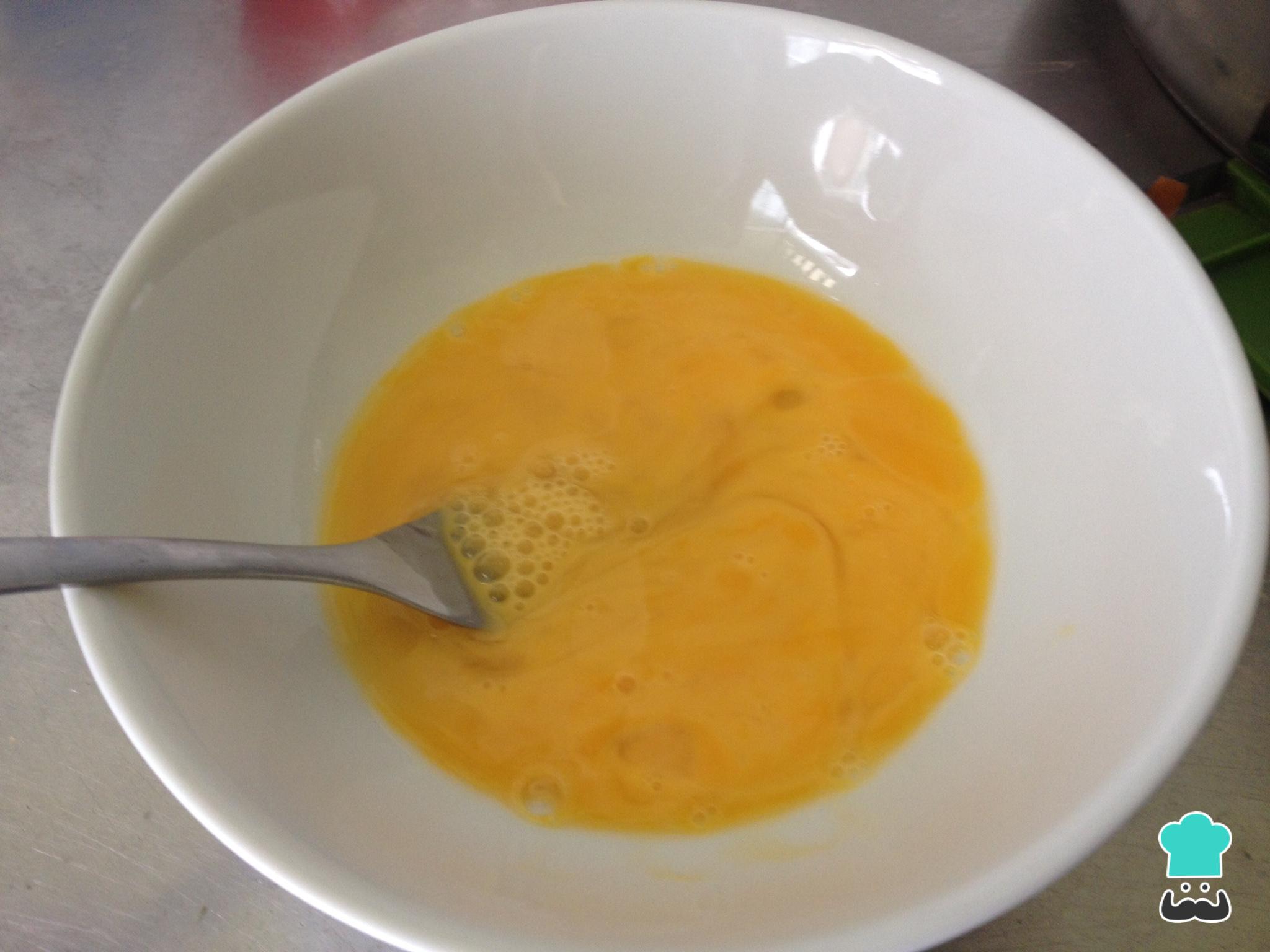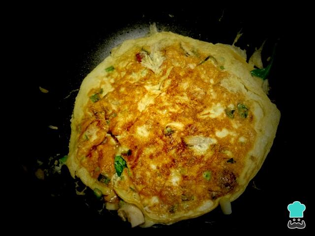 Leve ao fogo médio uma frigideira antiaderente com o azeite, e coloque aí a mistura de omelete. Deixe cozinhar por 3 minutos e, depois, com a ajuda de uma escumadeira e um garfo, vire a omelete ao contrário.