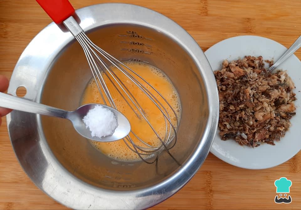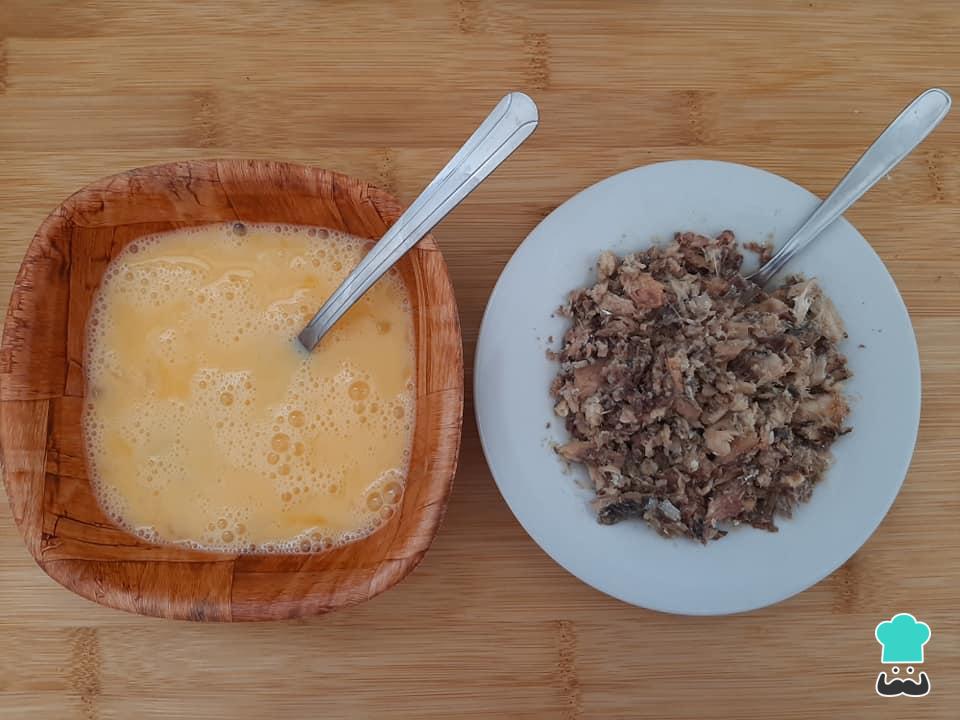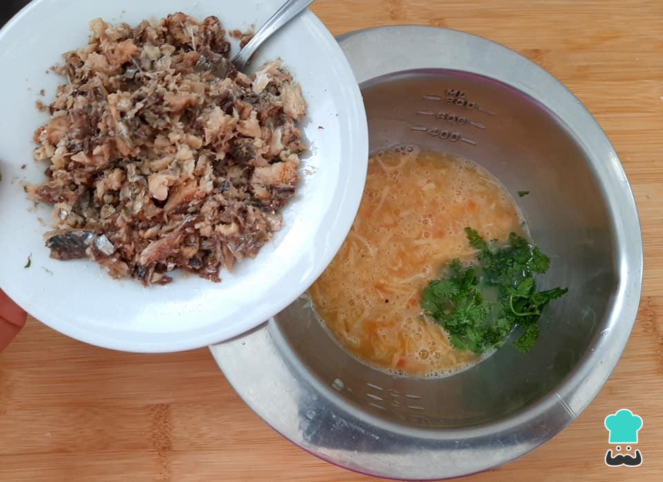Antes de começar a juntar os ingredientes, bata os ovos com um garfo e amasse a sardinha. Reserve.
