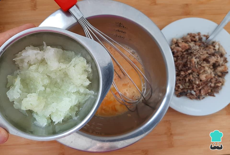 Acrescente a cebola ralada, que irá conferir mais sabor e textura nesta receita de omelete de sardinha simples e saborosa.