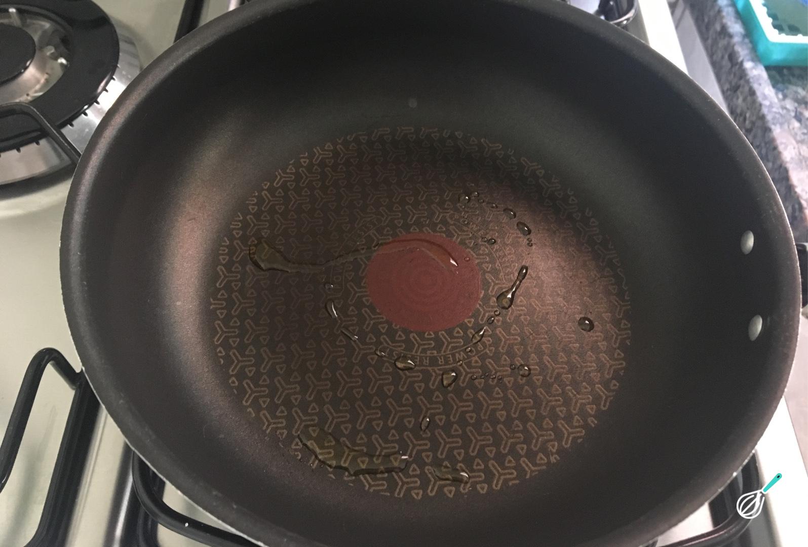 Esquente uma frigideira e coloque um fio de azeite, apenas o suficiente para o ovo não grudar.