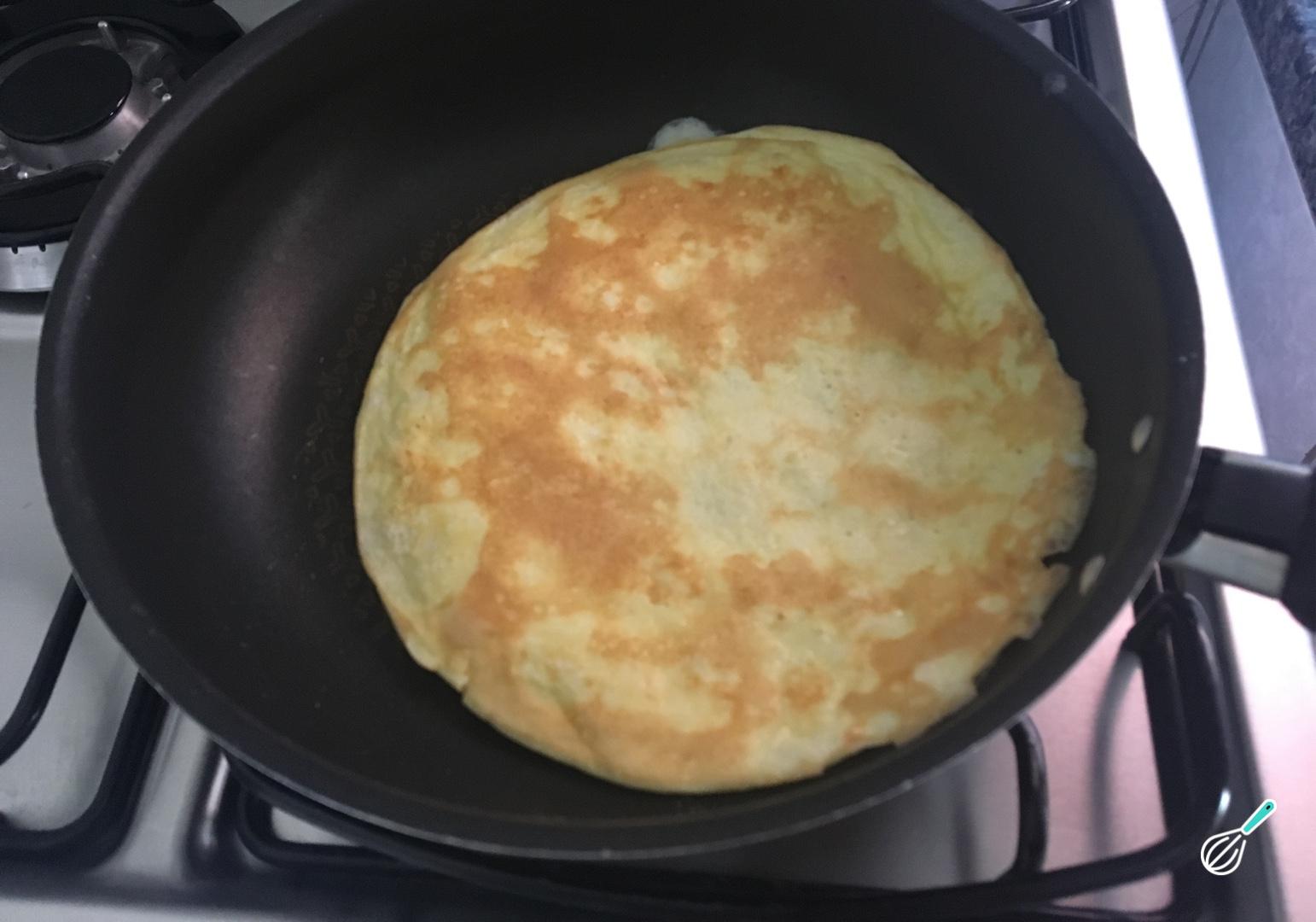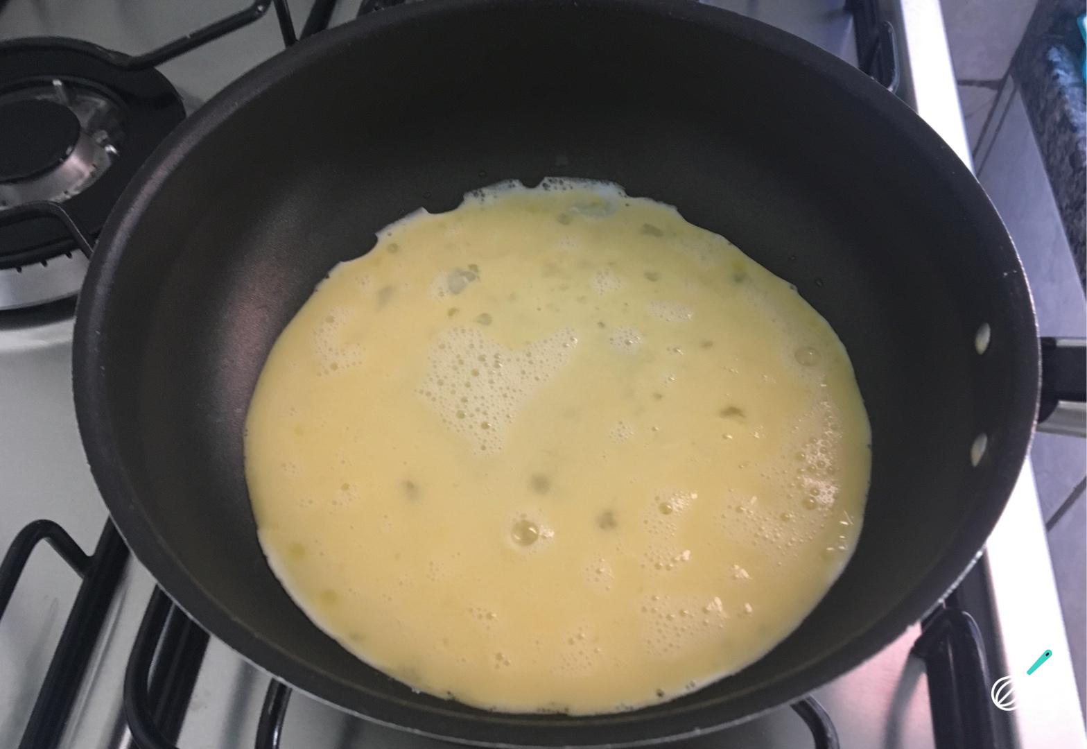 Em seguida coloque o omelete, tampe e deixe cozinhar em fogo baixo.