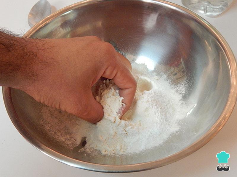 Para preparar essa receita de orelha de gato simples, comece por misturar os ingredientes secos numa tigela (a farinha, o açúcar, o sal e o fermento).