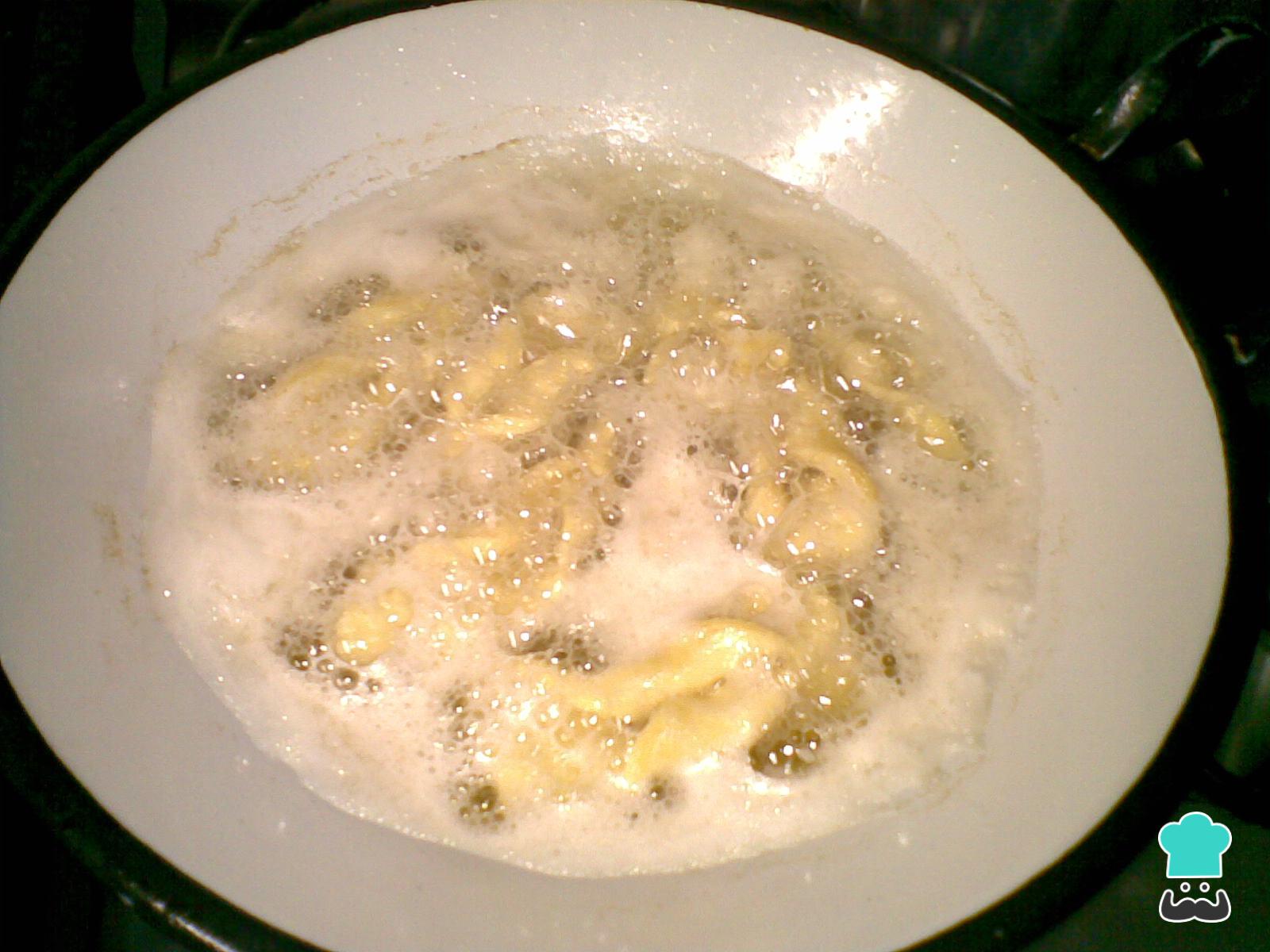 Coloque os biscoitos fritando em óleo quente. Se quiser evitar o cheiro a frituras, use óleo de canola ou óleo de milho.