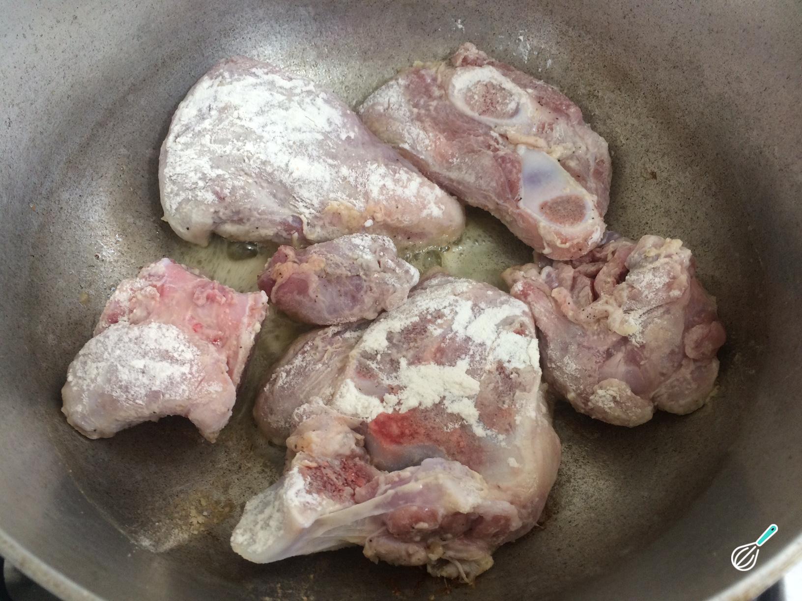 Em seguida tempere a carne com sal e pimenta a gosto, e envolva na farinha. Leve ao fogo médio uma panela comum ou de pressão com a manteiga e o azeite e, quando estiver quente, sele a carne de um lado e do outro. Retire a carne e reserve num prato à parte.