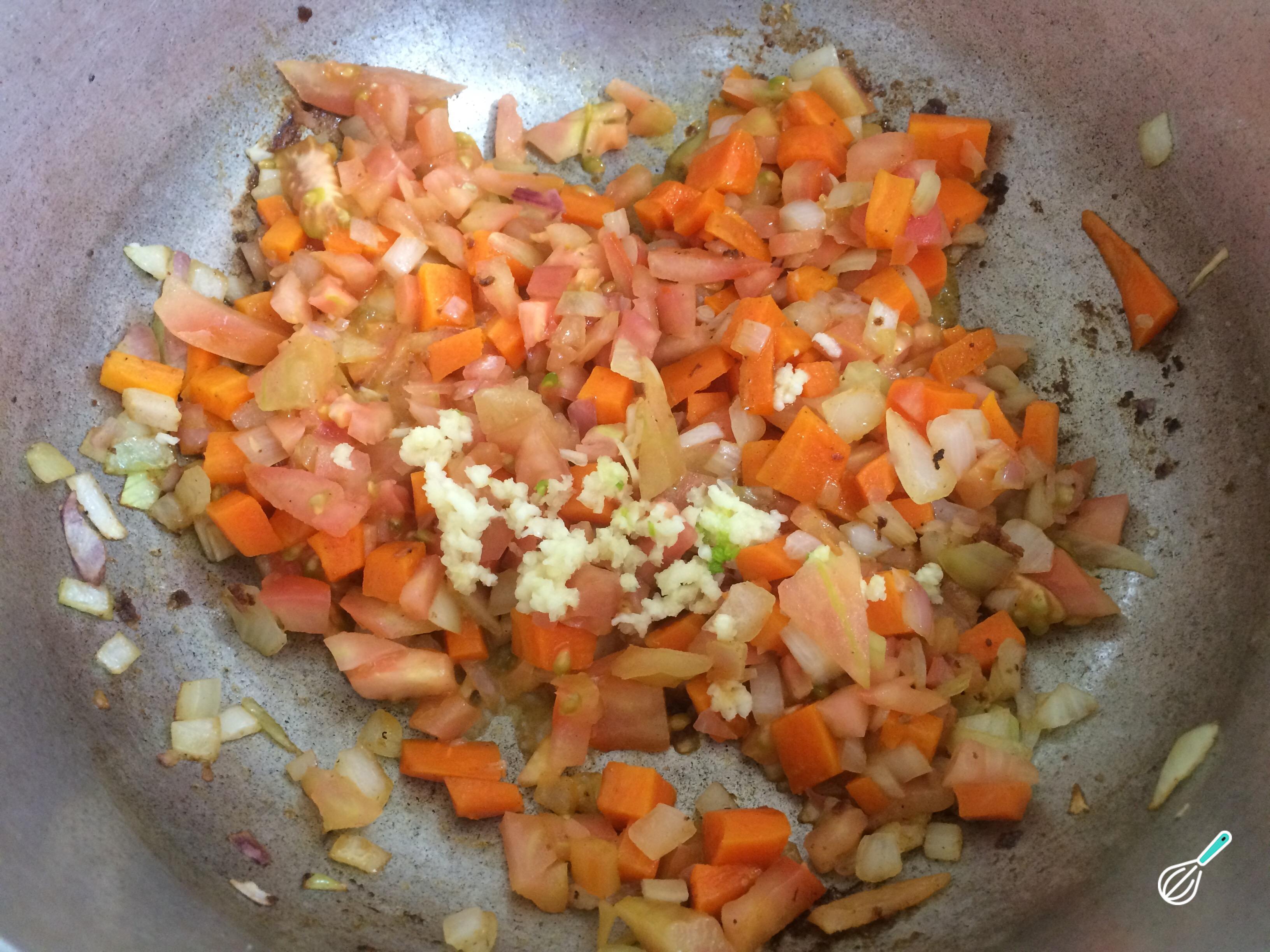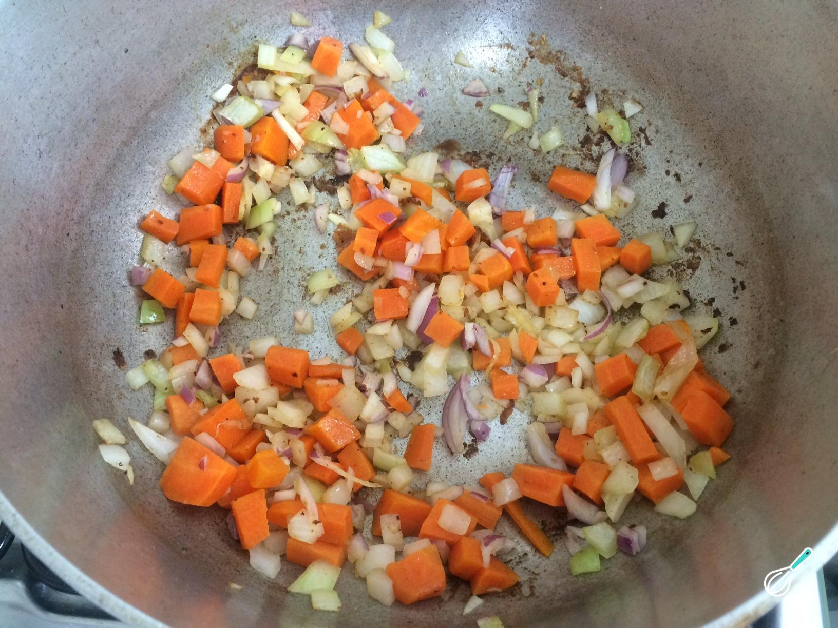 Na mesma panela, adicione a cebola e a cenoura, e cozinhe em fogo médio-baixo até que estejam macias.