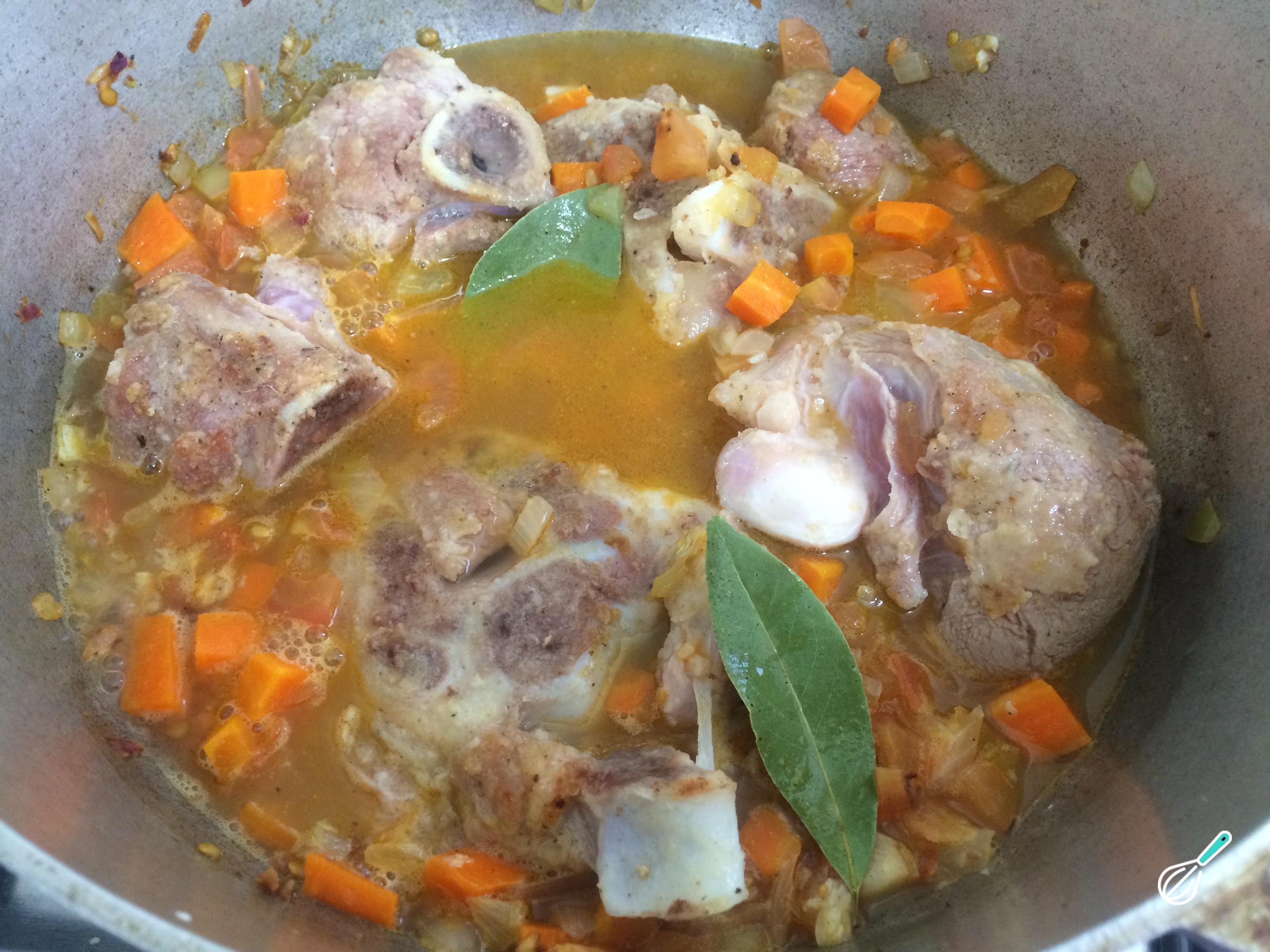 Após o passo anterior, acrescente o vinho e espere que o álcool evapore. Depois adicione o caldo de carne, o louro e a carne. Acerte o sabor com sal e pimenta, tampe e deixe cozinhar em fogo baixo por 1h30m.