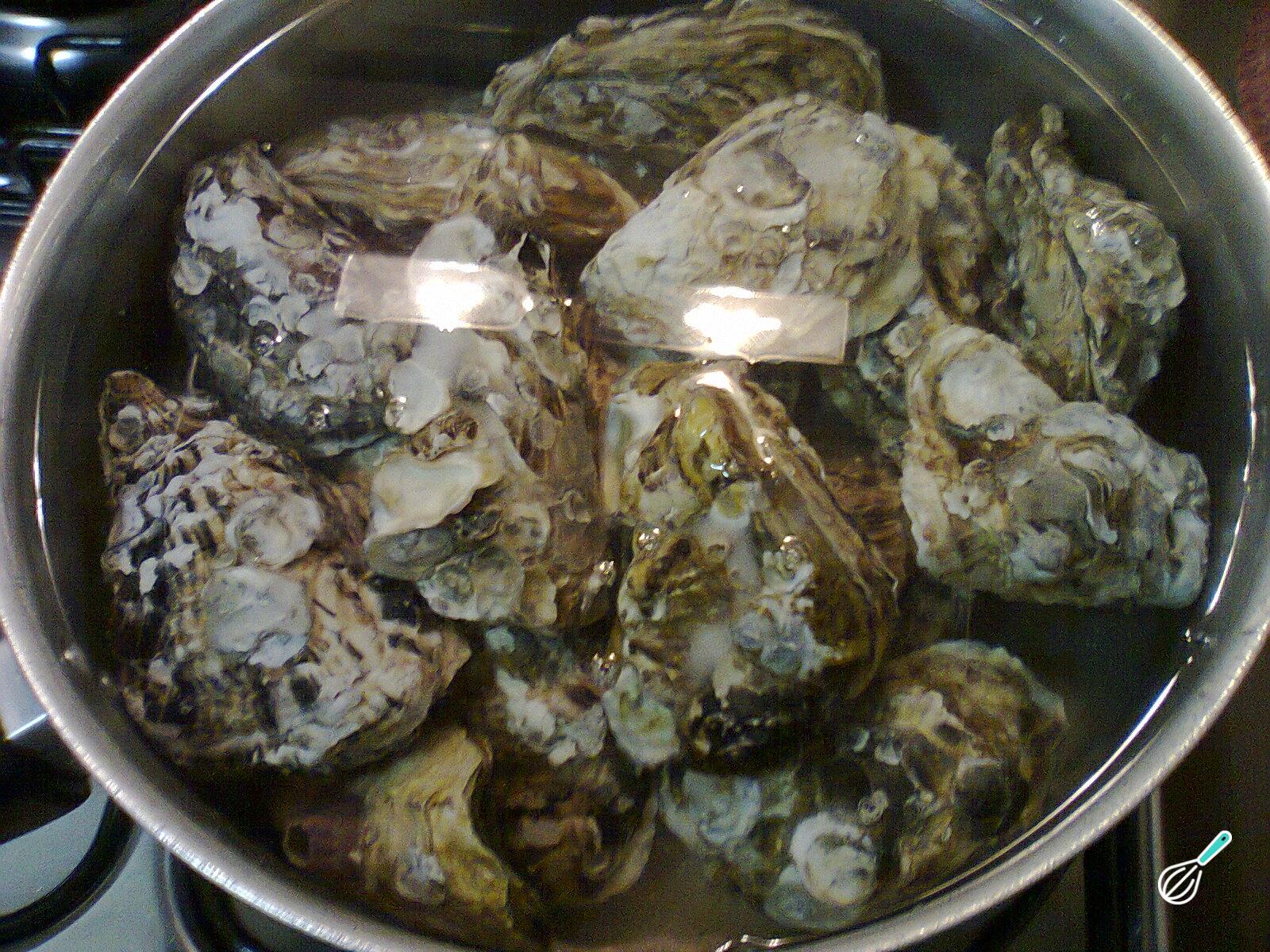 Junte as ostras, tampe a panela e leve ao fogo médio. Deixe cozinhar as ostras ao bafo até as conchas começarem a abrir (10 minutos, aproximadamente). Remova e coloque no gelo, para parar o cozimento e esfriar mais rapidamente.