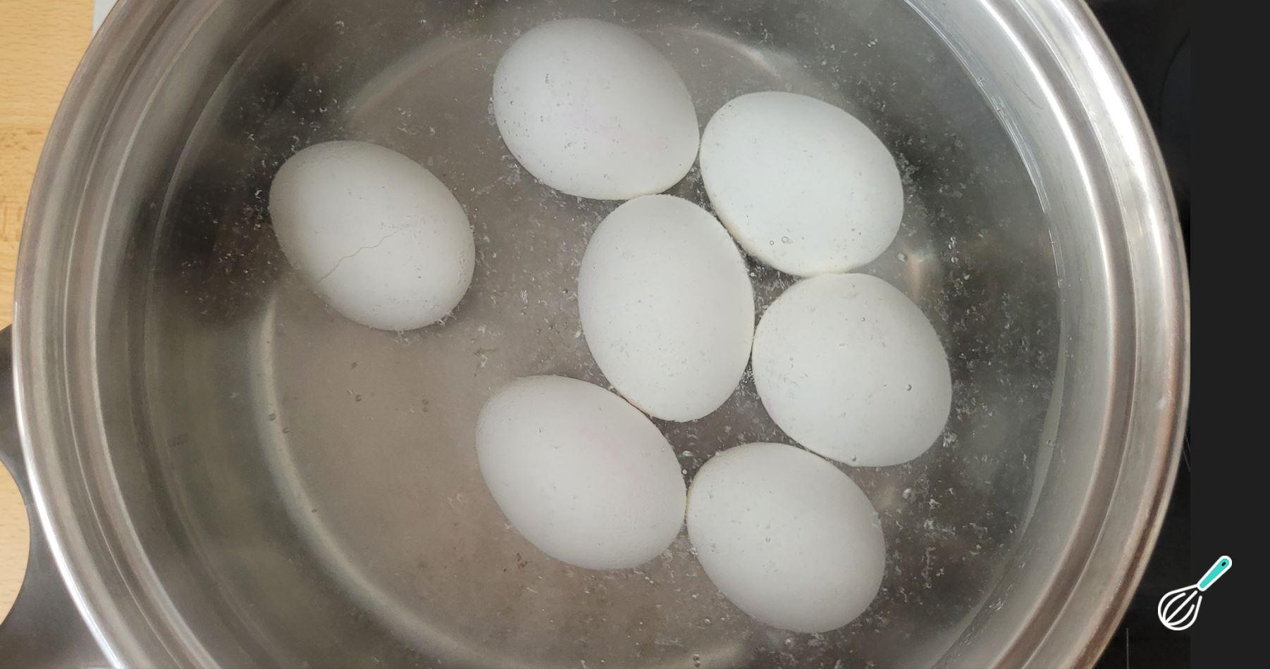 Comece cozinhando os ovos. Coloque em uma panela com água fria, ligue em fogo médio-alto. Quando ferver, abaixe o fogo e cozinhe por 10 minutos.