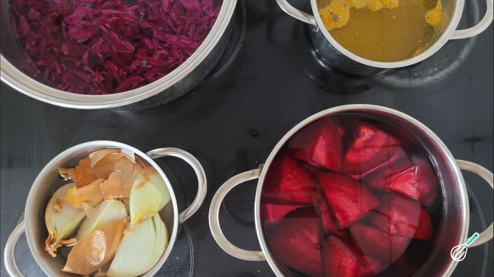 Manter a casca da beterraba também ajuda a manter mais o pigmento. Coloque a cebola, a beterraba, o repolho e a cúrcuma cada um em uma panela separada e leve ao fogo médio por aproximadamente 10-15 minutos, até ver que começaram a liberar sua cor na água.