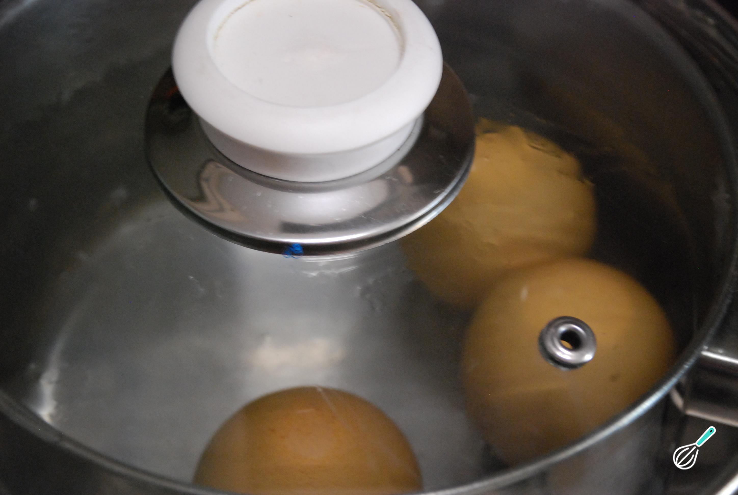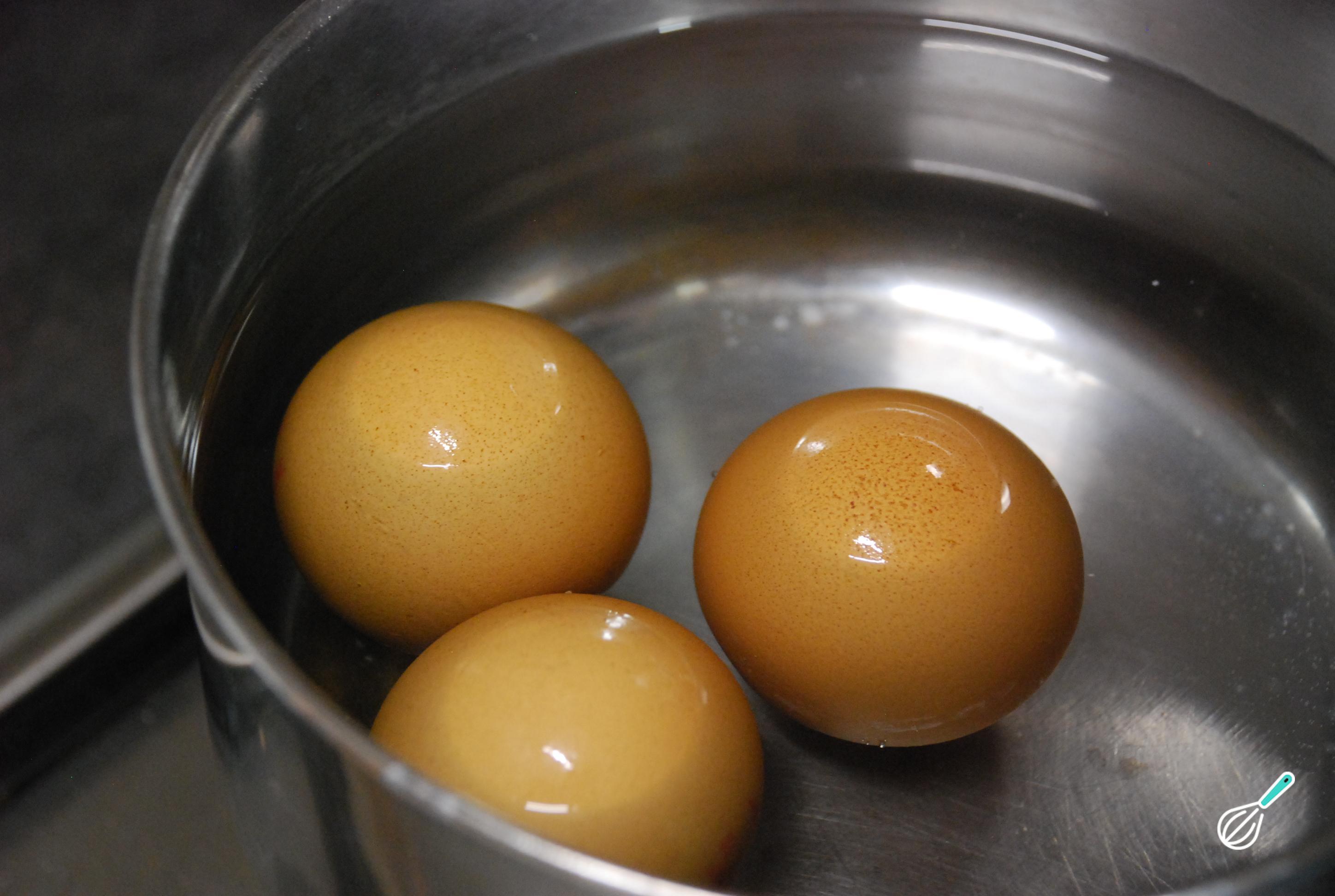 Para que os ovos fiquem firmes e bem cozinhados, desligue o fogo e tampe a panela assim que a água ferver. Deixe repousar até que a água esteja à temperatura ambiente.