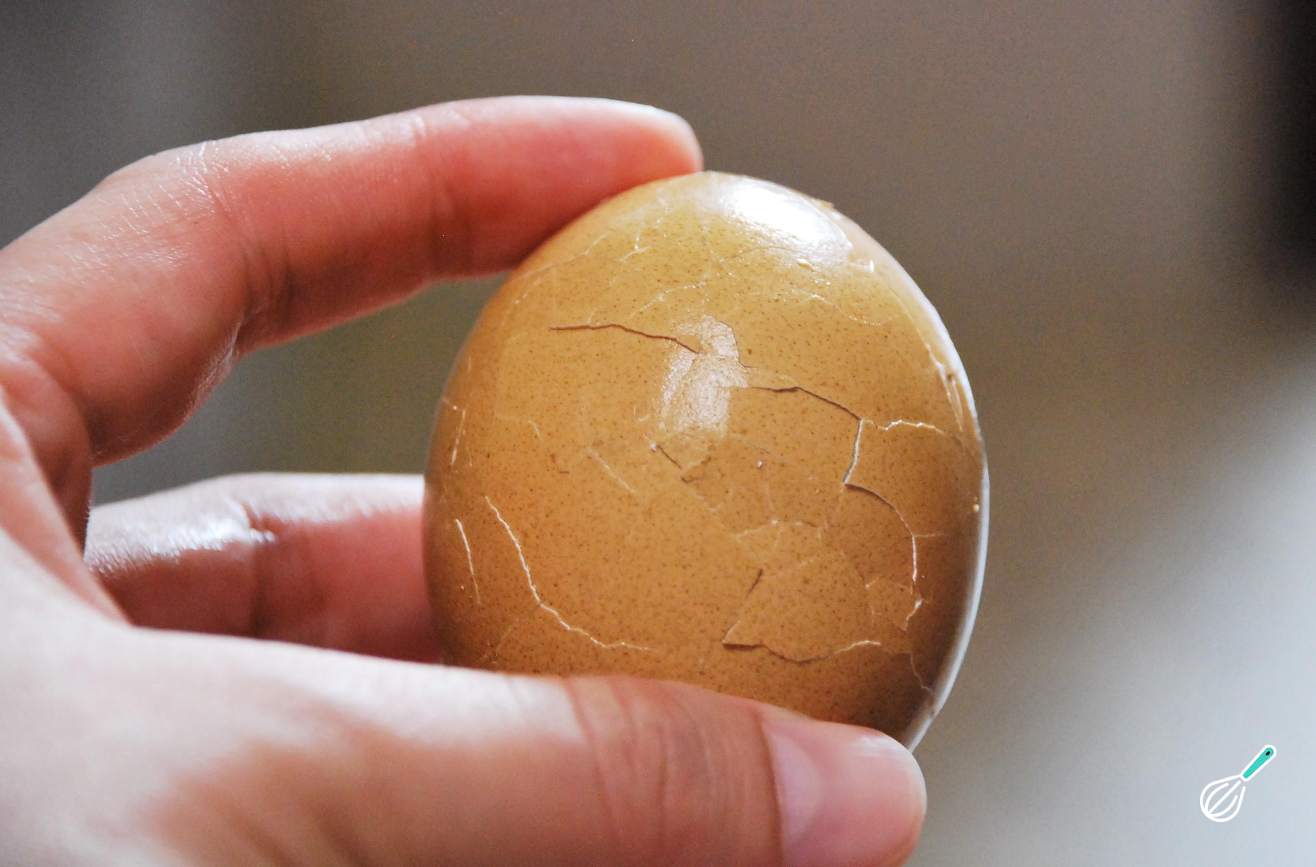 Quando a água já estiver à temperatura ambiente, passe os ovos por água fria. Com a ajuda de uma faca ou um garfo, golpeie suavemente a casca para rachar toda a superfície (como na fotografia).