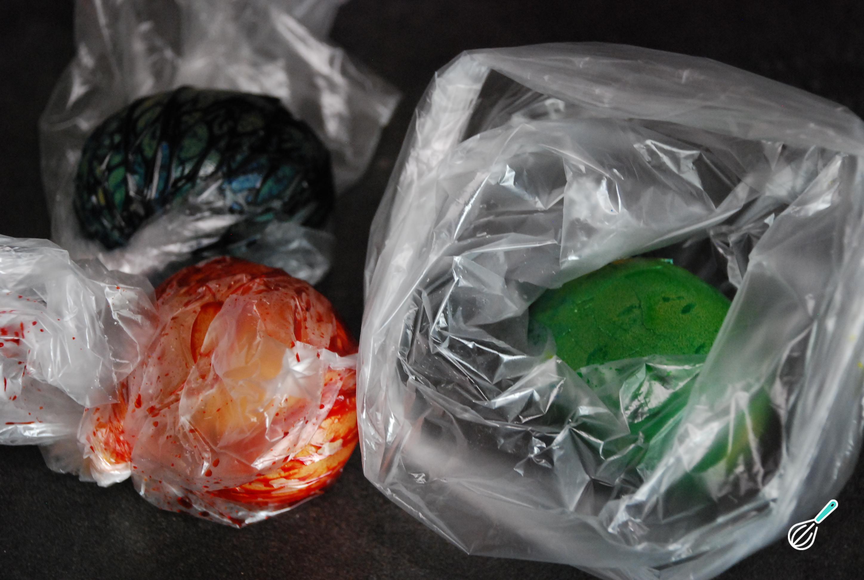 Em seguida, coloque cada ovo rachado dentro de um saco de plástico. Adicione o corante da cor desejada em cada um dos sacos e reserve. Eu usei as seguintes: