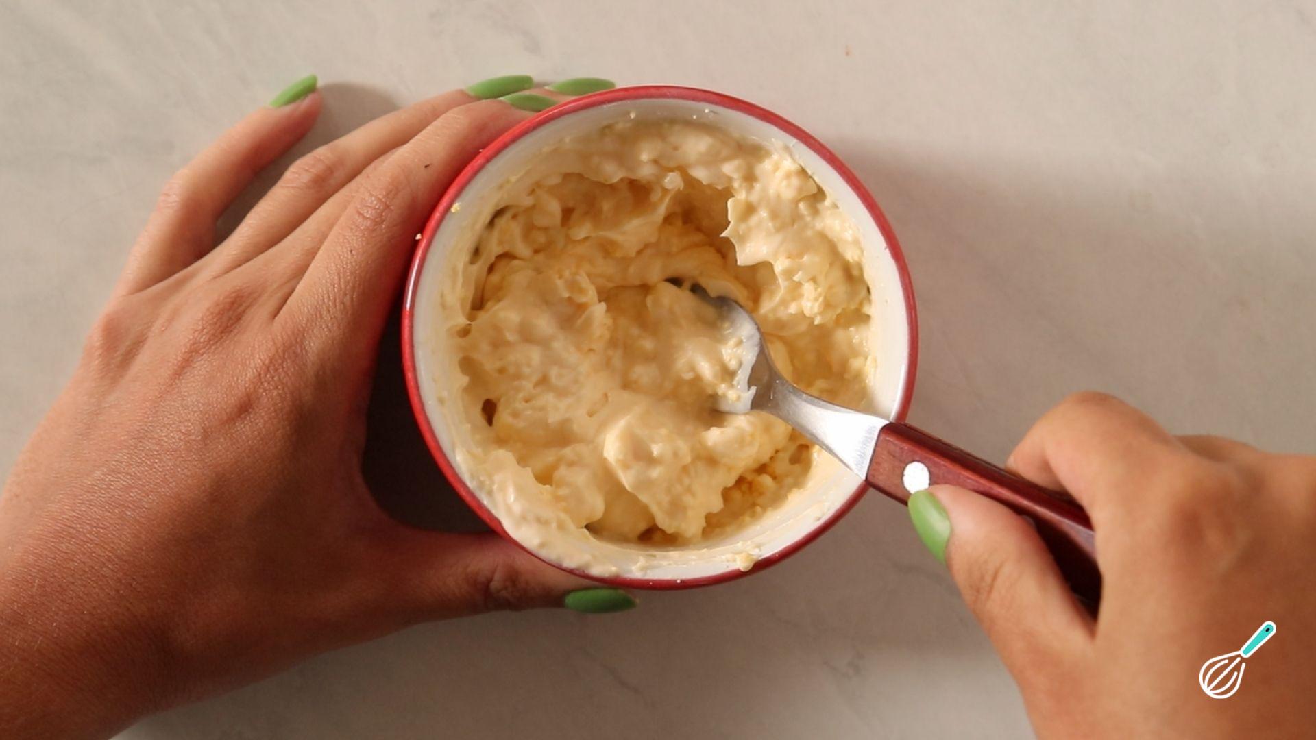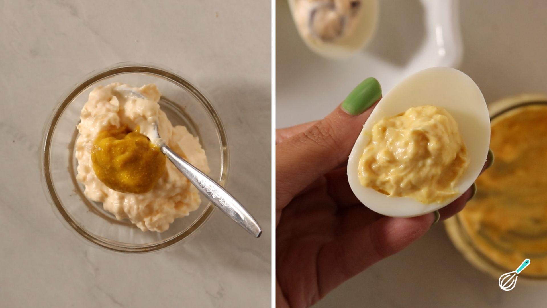 O terceiro sabor será a base mais um toque de mostarda e finalizada com orégano. Basta misturar a mostarda na base e rechear a clara cozida. Finalize com o orégano a gosto.