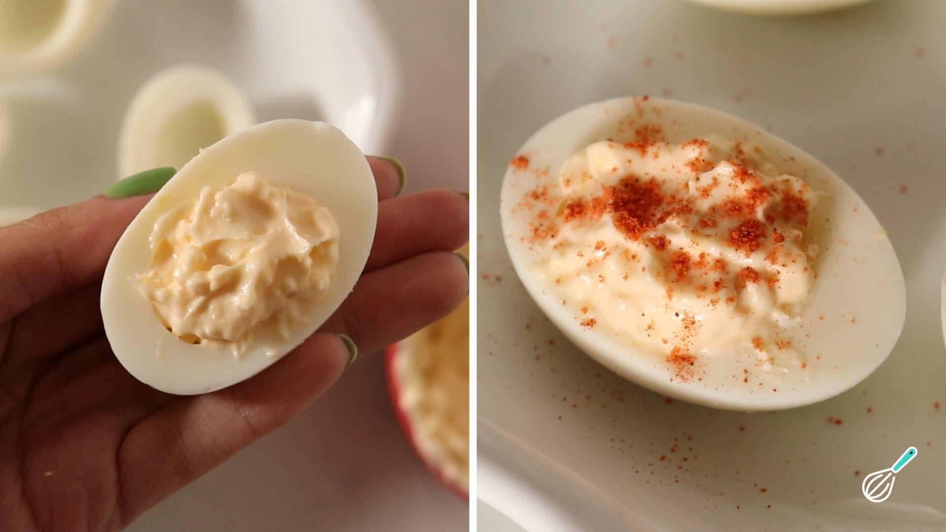 O primeiro sabor será a nossa base com um toque picante da páprica doce. Basta rechear a clara cozida com a base e finalizar com uma pitada do tempero.