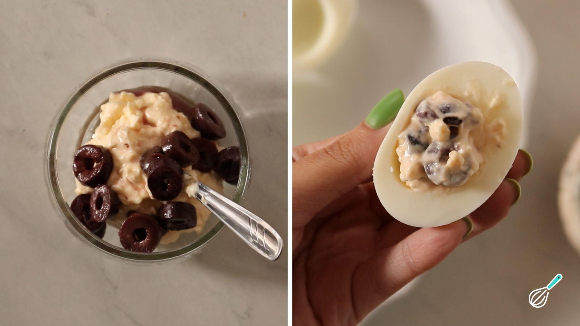 O segundo recheio será a base + azeitonas pretas. Basta misturar as azeitonas picadas na base e rechear a clara cozida.