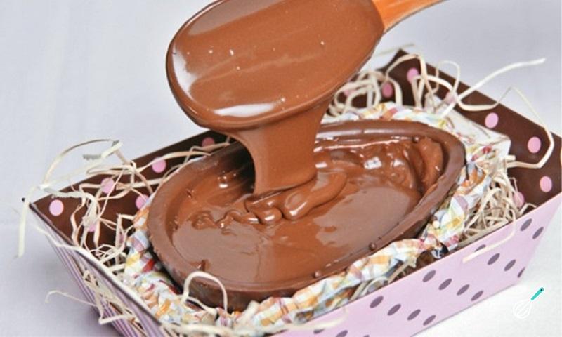 O primeiro passo para preparar seu ovo de Páscoa é picar 2/3 do chocolate e levá-lo a derreter no microondas em potência máxima, parando para mexer a cada 30 segundos. Ao fim de alguns minutos ele deverá estar completamente derretido.
