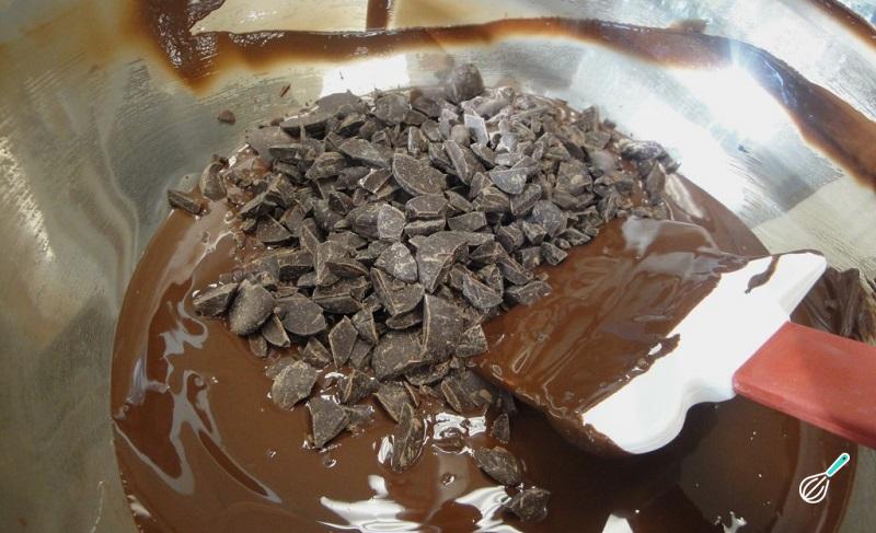 Adicione o chocolate que reservado anteriormente ao chocolate derretido, e mexa até dissolver por completo. Este passo se chama de "temperagem" e é importante para garantir que o ovo não derrete mais tarde.