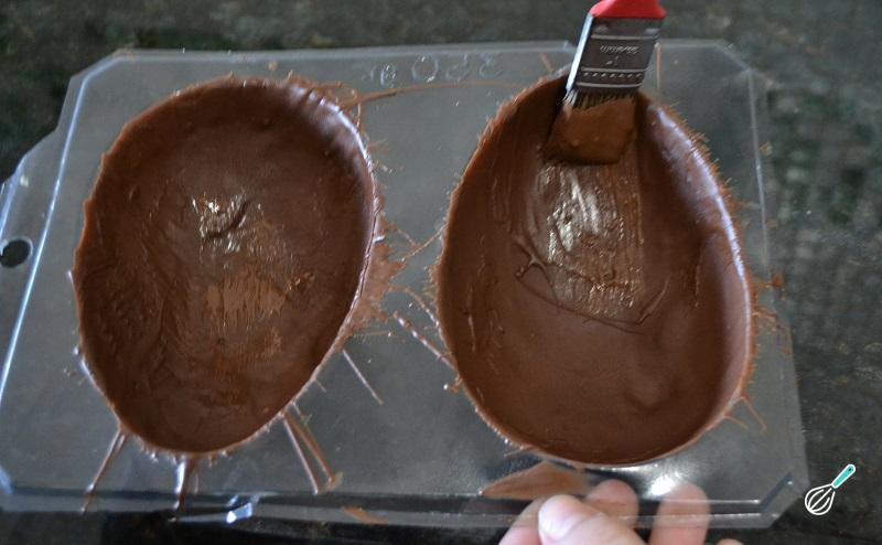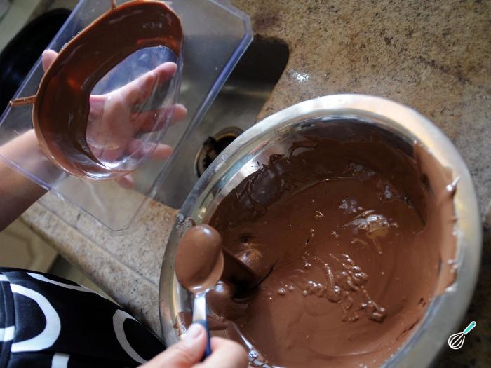 Espere o chocolate esfriar até ficar à temperatura ambiente. Coloque 2 colheres de sopa de chocolate nos moldes de ovo de Páscoa e espalhe com a colher ou pincel de culinária. Leve à geladeira por 10 minutos.