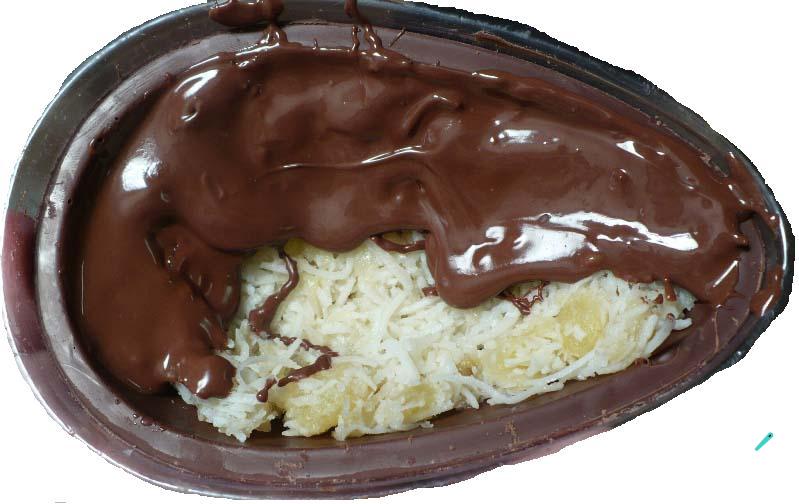 Quando o beijinho de coco estiver esfriado, recheie os moldes do ovo de Páscoa. Cubra com o chocolate que reservou antes (poderá ser necessário reaquecer no microondas) e leve à geladeira por 30 minutos a 1 hora.