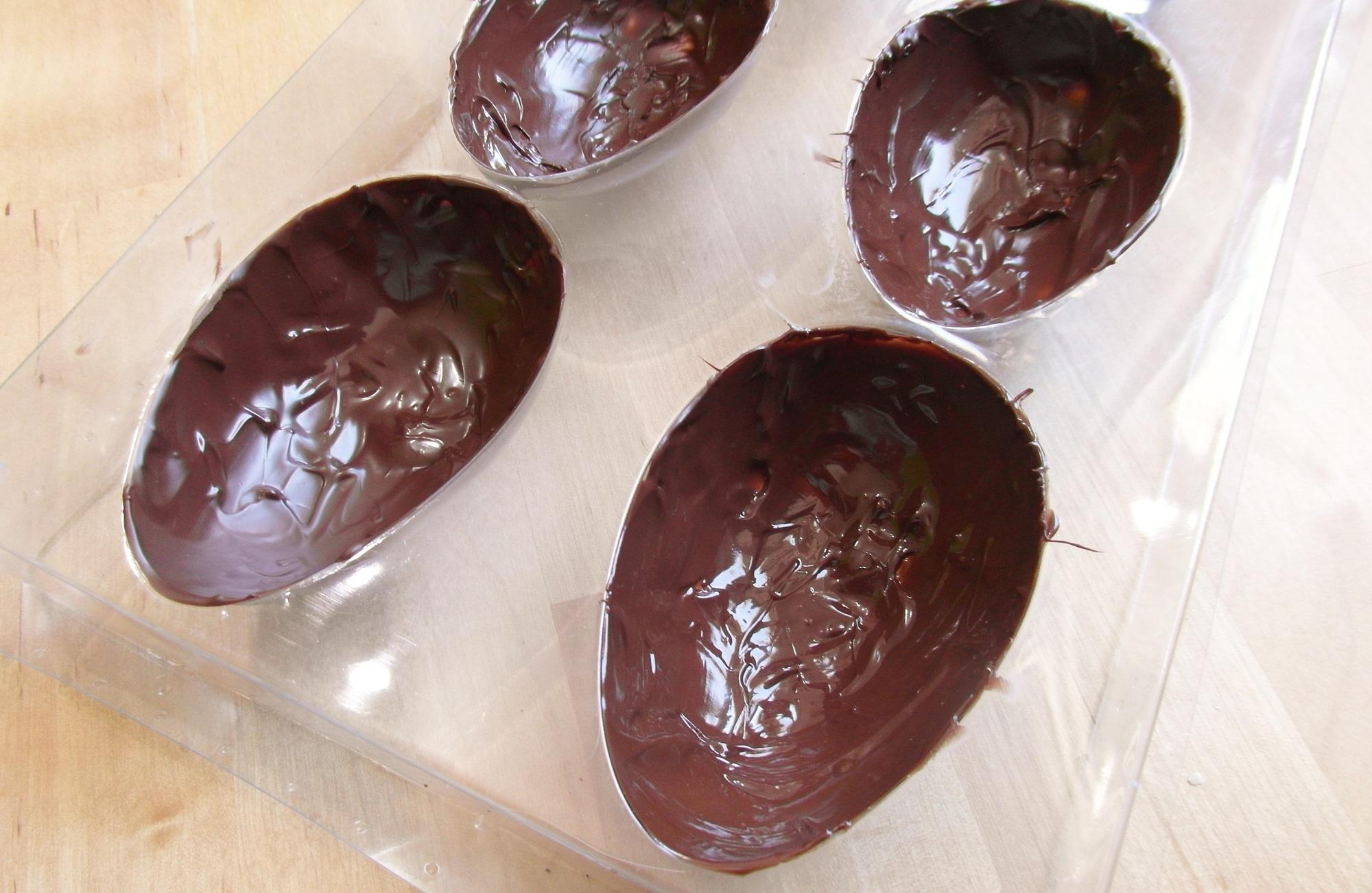 Se você estiver usando chocolate nobre/puro, confira como temperar chocolate para garantir que ele fica brilhoso e não derrete. Pingue um pouco de chocolate na forminha de ovo e espalhe com um pincel ou colher pelo fundo e laterais, de forma a obter uma camada fina e uniforme. Coloque ao freezer por 5-10 minutos.