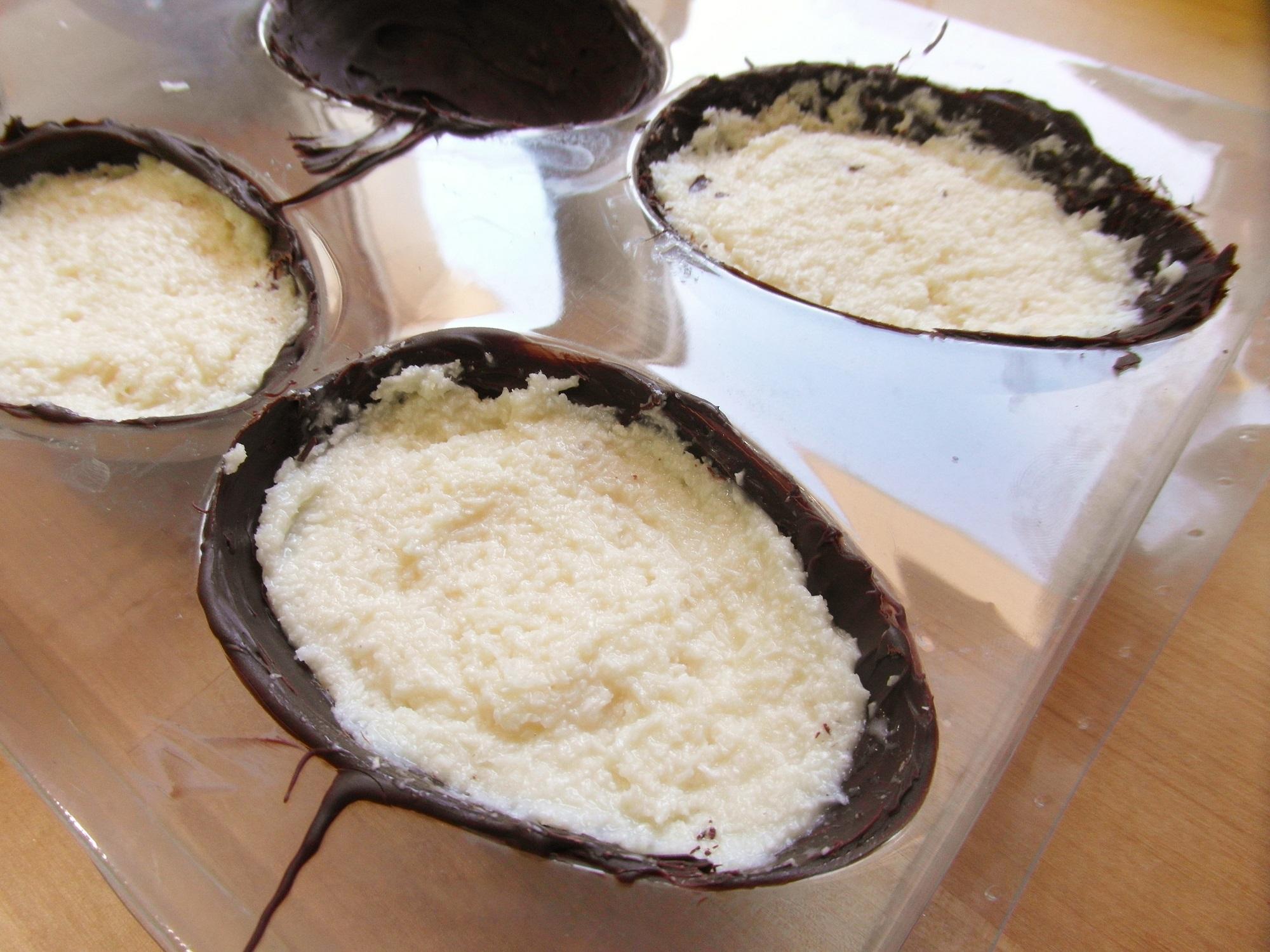 Seguidamente prepare o recheio de prestígio: leve ao fogo o leite condensado, o coco ralado e o chocolate branco e fique mexendo até engrossar. Desligue, deixe amornar e coloque nas forminhas. Deixe algum espaço livre até ao topo, complete com o restante chocolate derretido e reserve no freezer por 15-30 minutos.