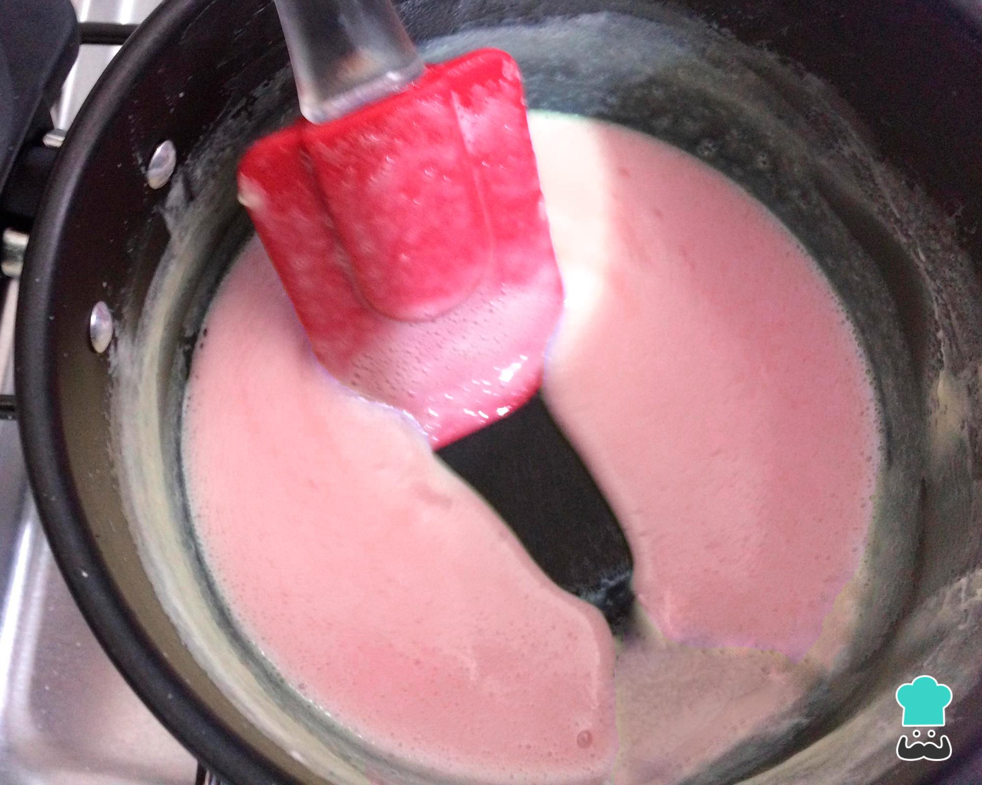 Agora prepare o recheio deste ovo de Páscoa de colher de morango: numa panela dissolva a gelatina no creme de leite, junte o leite condensado e o chocolate e fique mexendo até engrossar na consistência de brigadeiro de colher. Junte a manteiga, mexa mais um pouco e desligue. Reserve até amornar.