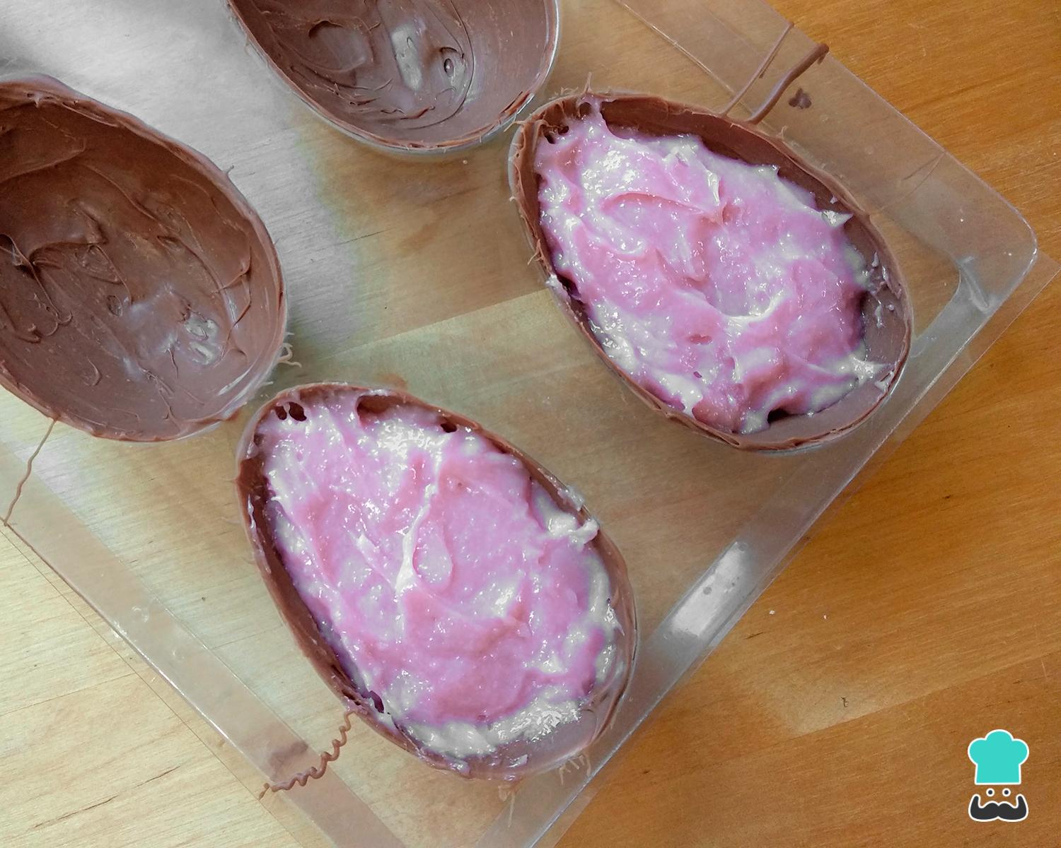 Recheie os ovos de chocolate até ao topo com o creme anterior e polvilhe o granulado de chocolate. Leve à geladeira por, no mínimo, 1 hora.